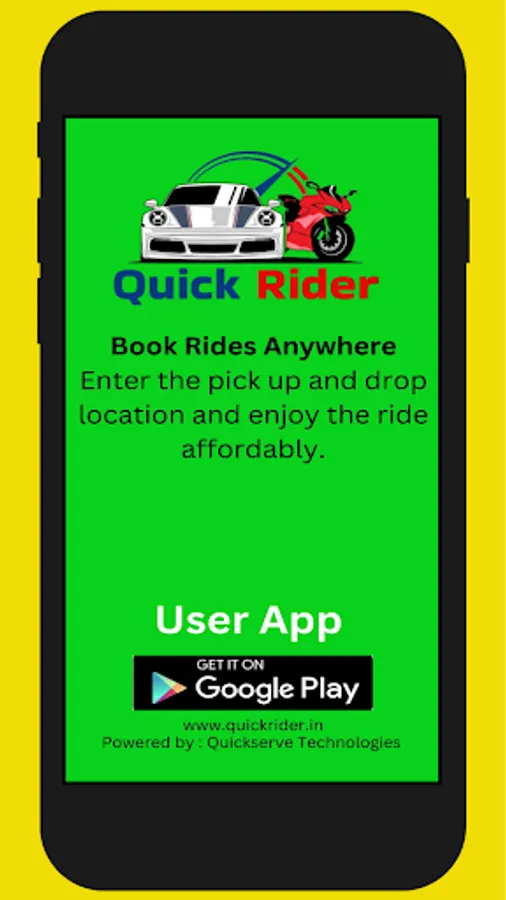 Quick Rider - is a App based bike, taxi booking system. Quick Services Pvt. Ltd. (OPC) has designed it. Quick Rider is a cloud-based booking platform that allows customers to book any transport service all online from the comfort of their own pickup locations using any online device such as mobile handset or PC. The main goal of the application is limited to provide an online service only to set connectivity between a customer with an available service on the basis of the real-time search. Hence the scope of taxi services is not defined by the application. All the available services connected or