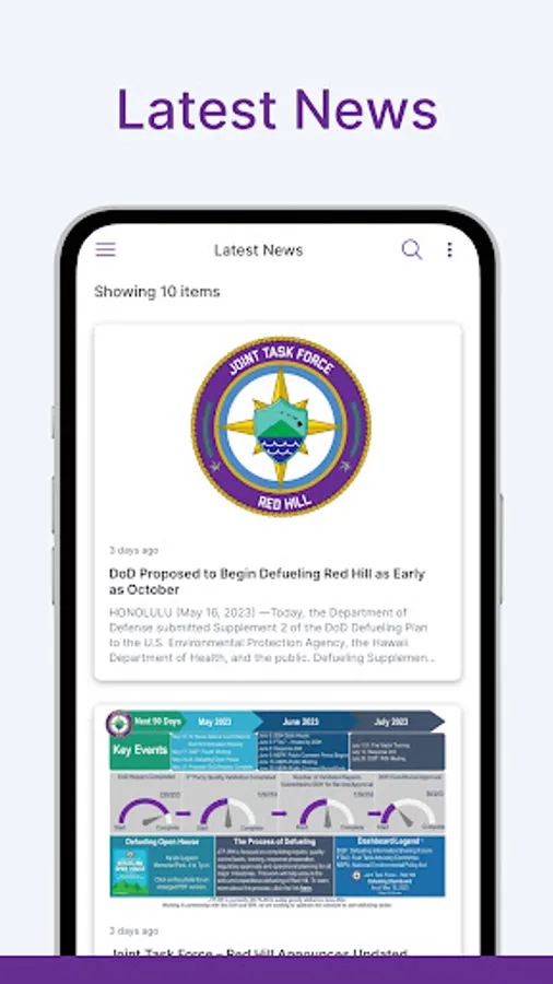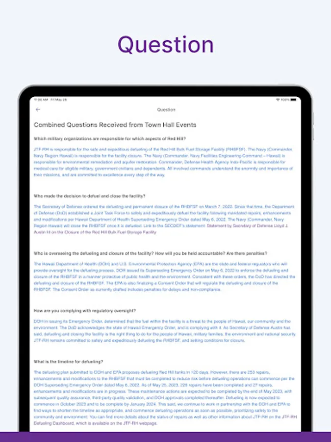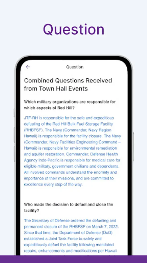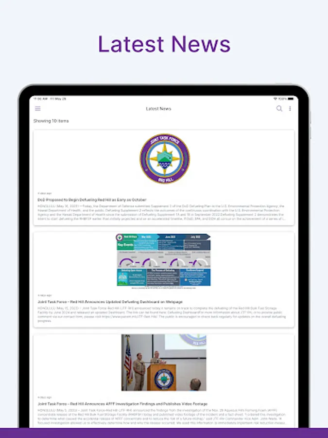 Joint Task Force-Red Hill (JTF-Red Hill) is dedicated to coordinating with State and Federal stakeholders to ensure the safe and expeditious defueling of the Red Hill Bulk Fuel Storage Facility (RHBFSF), all while working towards the ultimate goal of setting conditions for closure. Our app provides you with real-time updates and information regarding the progress of defueling operations. Stay informed about the latest developments, milestones, and safety measures implemented by JTF-Red Hill. With our user-friendly interface, users can learn the status of progress, easily access news releases, helpful links, photos, educational videos, the defueling plan, and more. Rebuilding trust with the State of Hawaii and the local community of Oahu is a crucial aspect of our mission. Through this app, we strive to maintain transparency and open communication of our timeline to defuel the facility. Key Features: -Updates on the defueling progress -Important documents and resources at your fingertips -Stay informed through news releases -Become educated on milestones through educational videos -Keep track of upcoming events Download the JTF-Red Hill app now and be a part of our collective efforts to ensure the safe and expeditious defueling of the Red Hill Bulk Fuel Storage Facility.