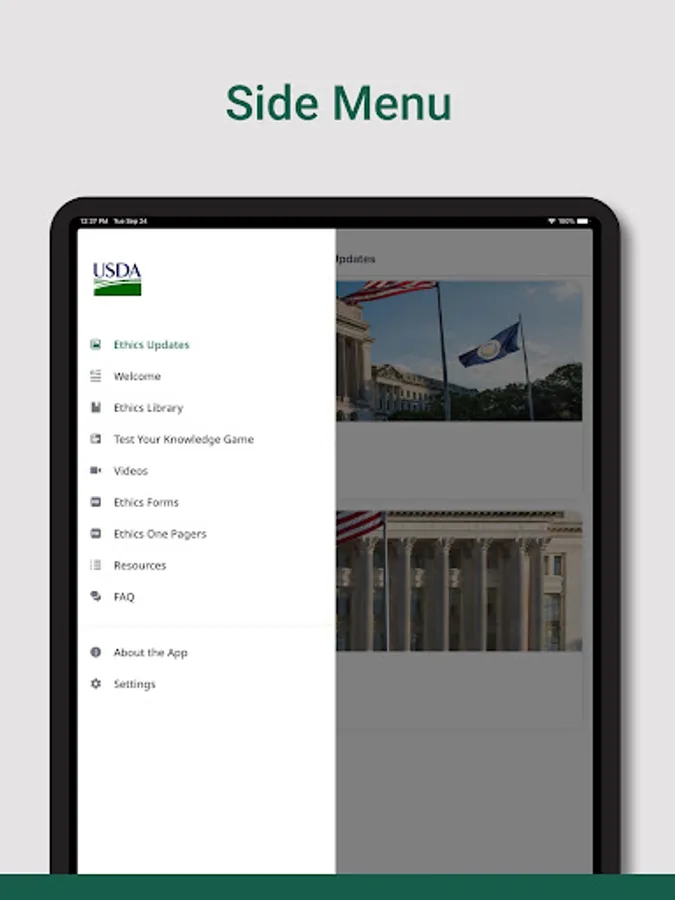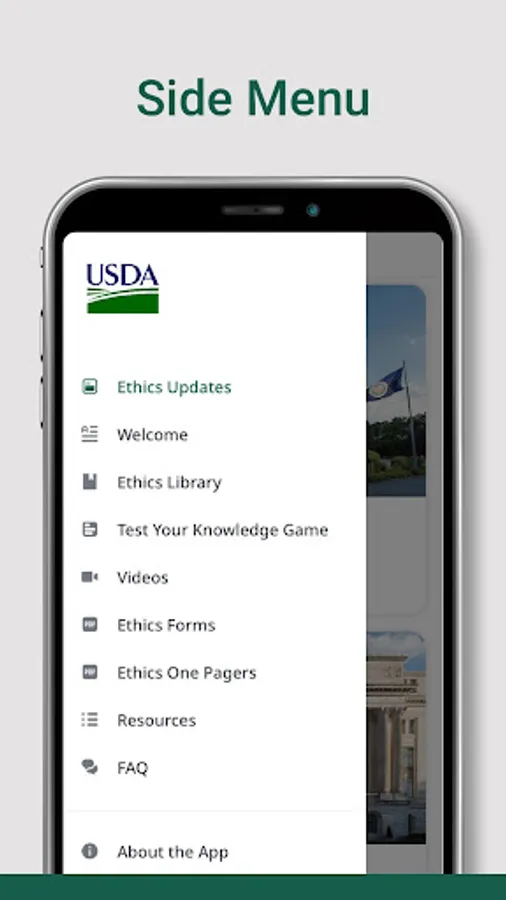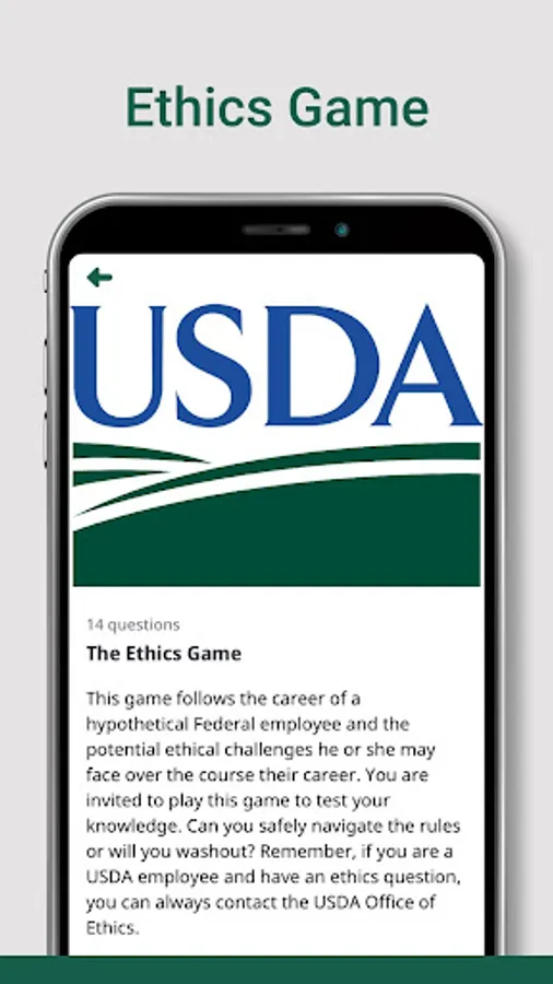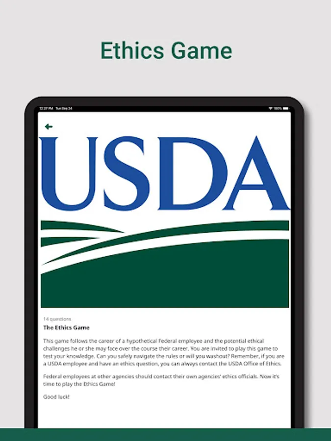 This interactive mobile app provides USDA employees – and other Federal government employees – with short easy-to-read summaries of the Federal ethics rules and the Hatch Act's limitations on political activity. This information is available, at your fingertips, in a well-organized Ethics Library.