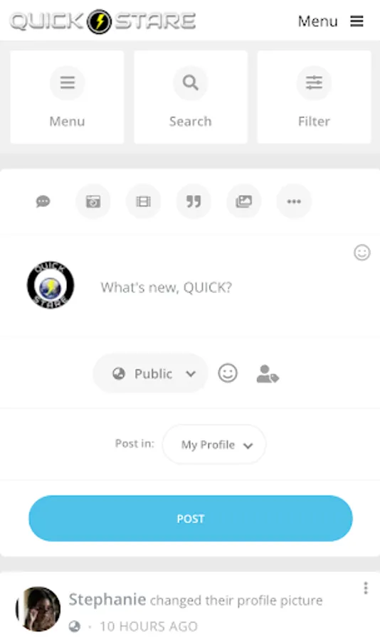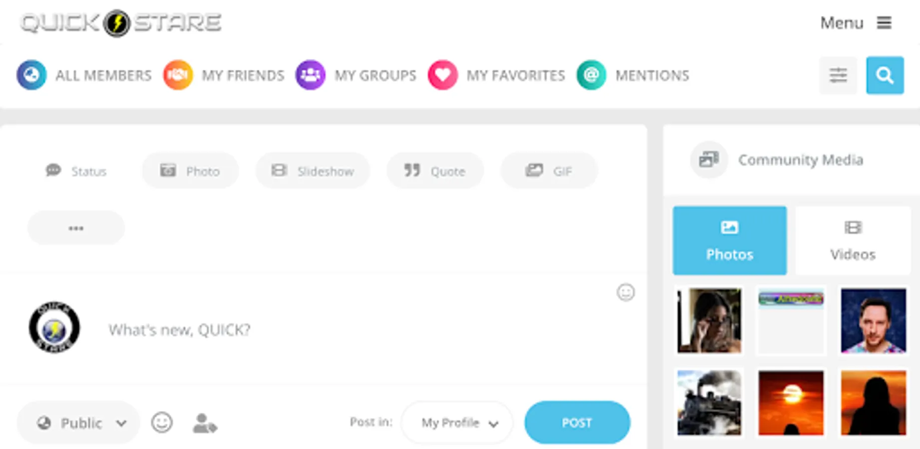 After log in, the expanded menu provides a world of features, some of which are listed above. There are 3 main feeds and this includes the Post feed, that is made up of posts created by Quick Stare users. The Stream which is a global feed made up by user and group status updates. And the Feed, which is your personal and friends updates. The stream and feed can be filtered for content types ie images, slideshows, videos etc and also filtered by members, friends and groups.