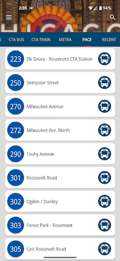 - All routes supported on Pace Bus Tracker are supported.