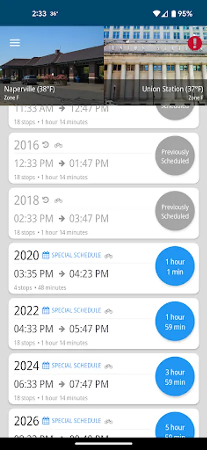 - Access your favorite Metra stations to get estimated departure/arrival times and/or schedules for the day.