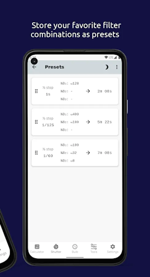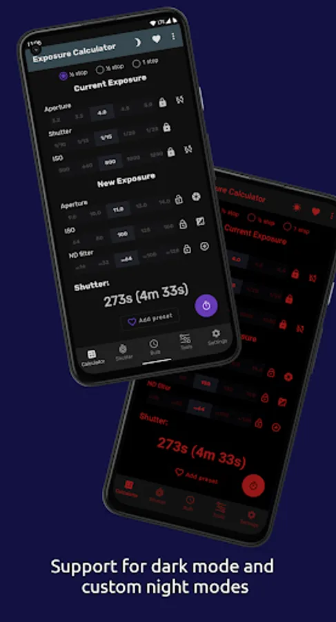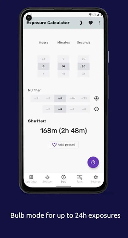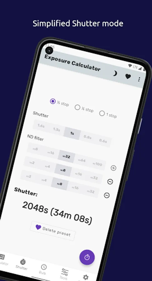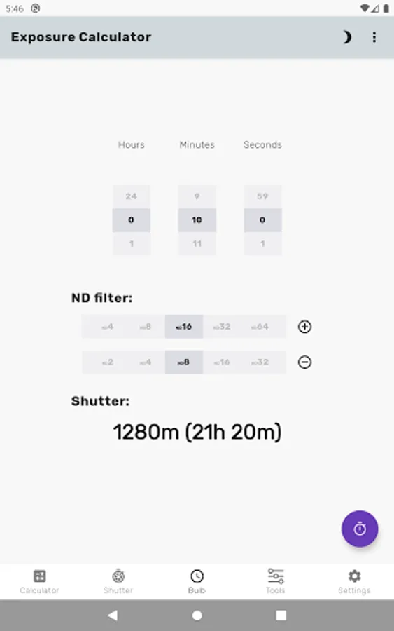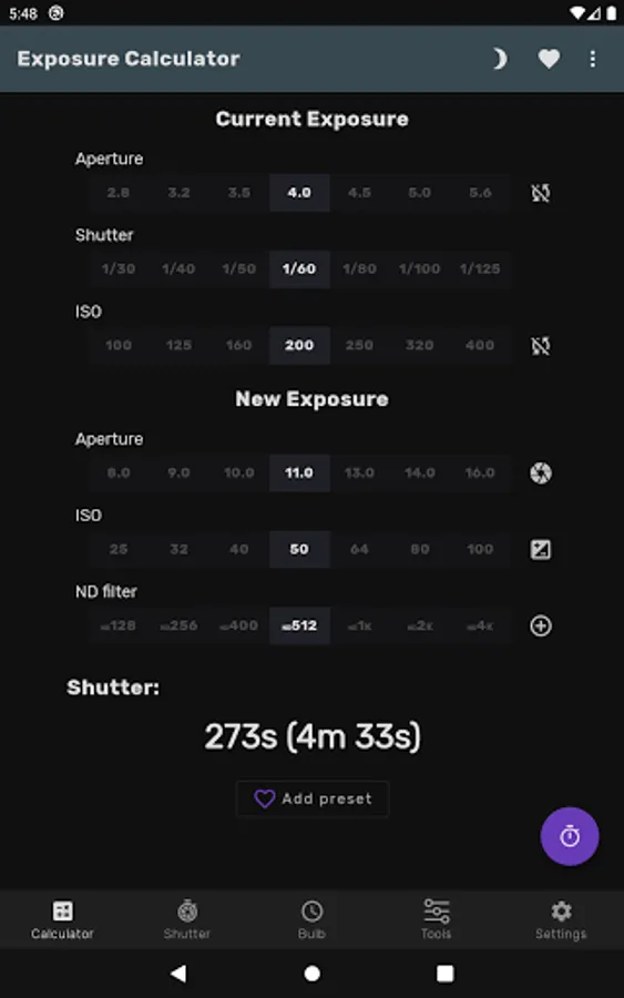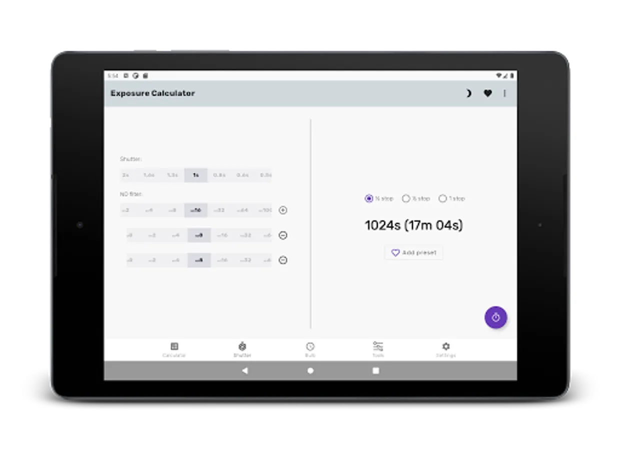 It is also possible to add up to 3 ND filters of up to 30 stops each to the calculations, handy for those long exposure photographs to blur water and clouds.