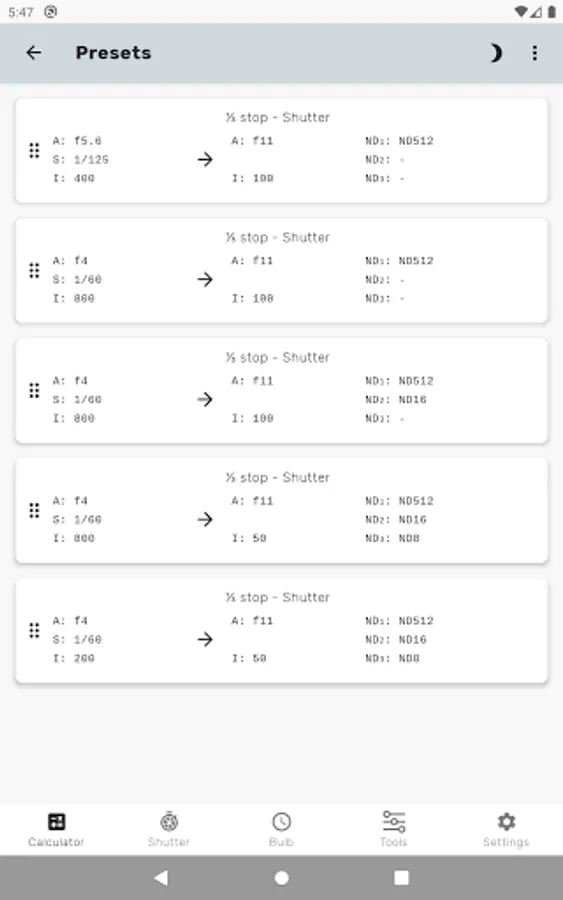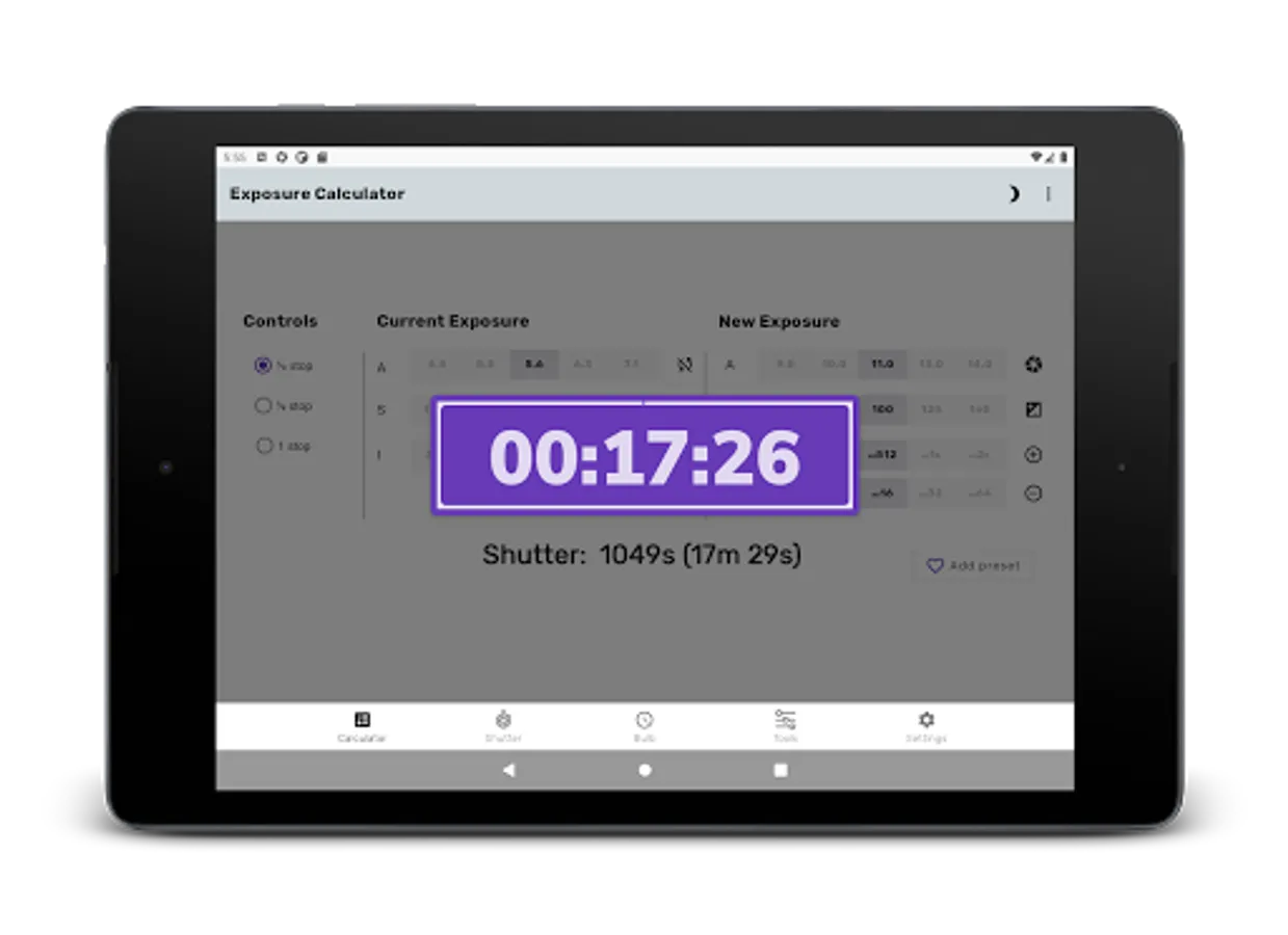 Given an exposure (Aperture, Shutter speed, ISO), allows calculating equivalent exposures - set 2 new parameters (a combination of Aperture, Shutter and ISO) and the 3rd parameter is automatically calculated.