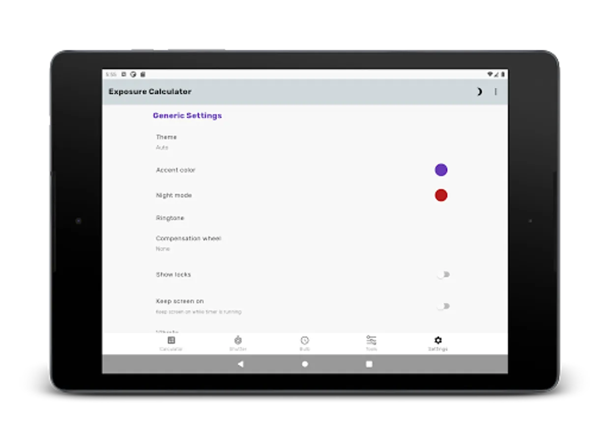 Note: in the Shutter settings section there is a switch tor camera type. This switch simply selects how a small set of shutter speeds around 1 second are displayed, choose the one your camera adheres to. Exposure calculations work for all camera makes, this switch is simply for display purposes.