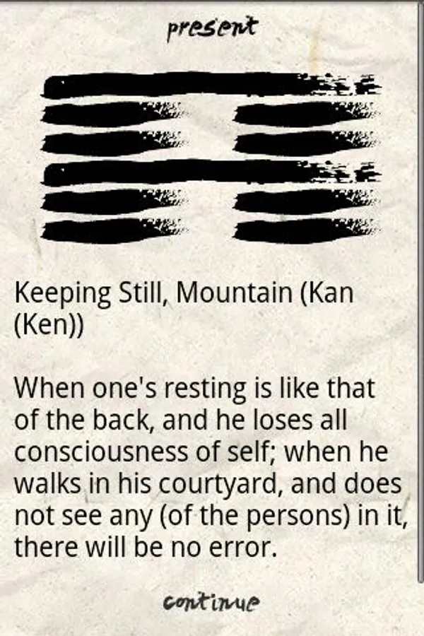 A classic I Ching app. A clean and pretty interface with cool animations. Comes with 2 widgets, a translation (James Legge based) of the IChing book, and casting by the coin and yarrow methods