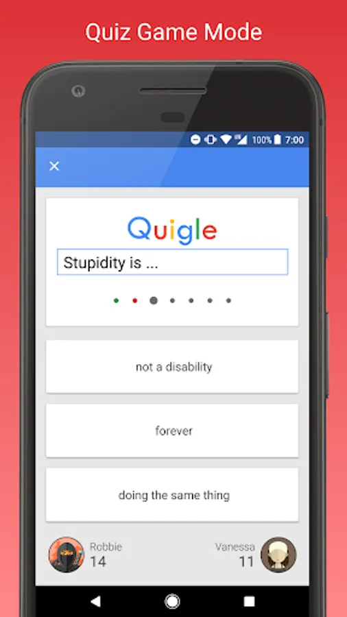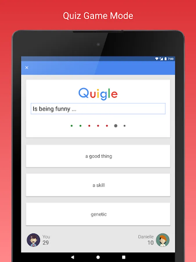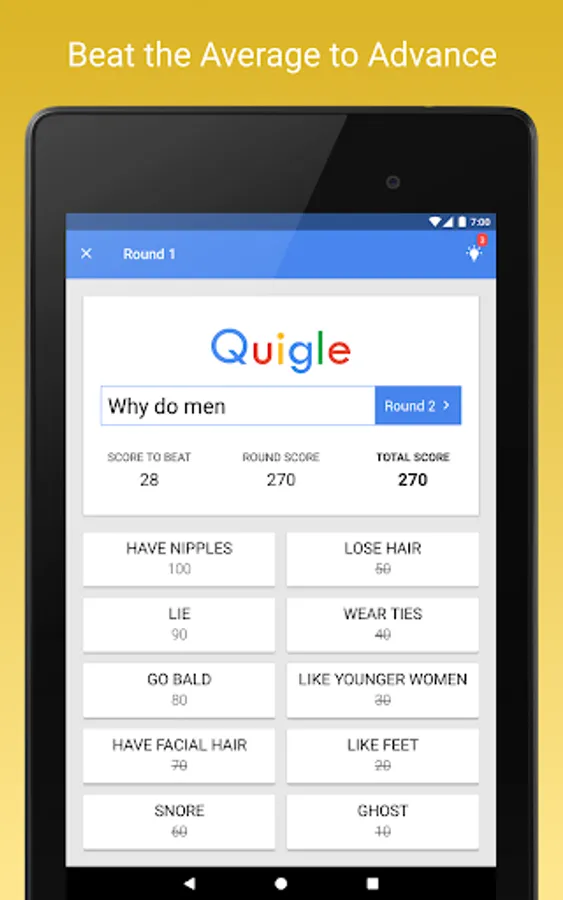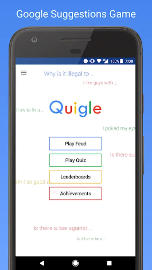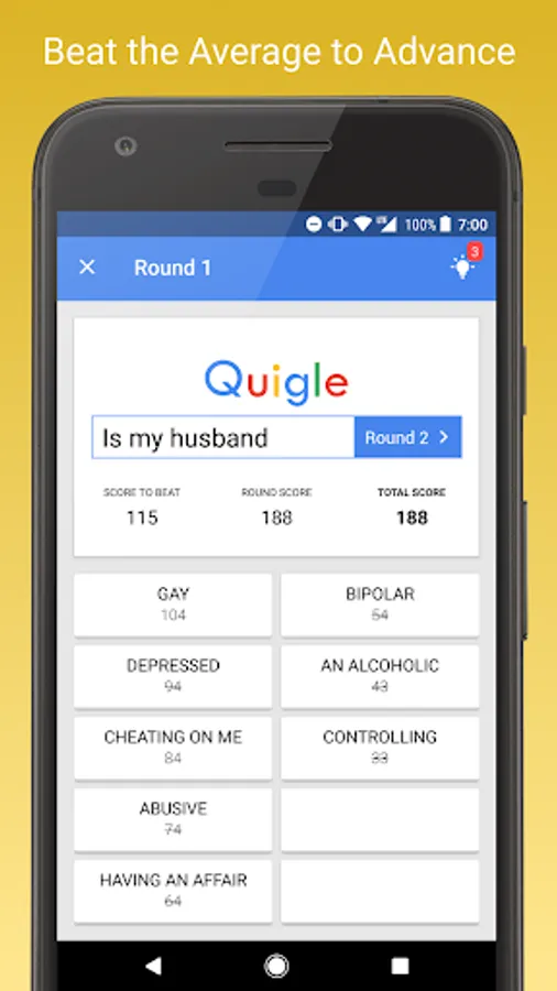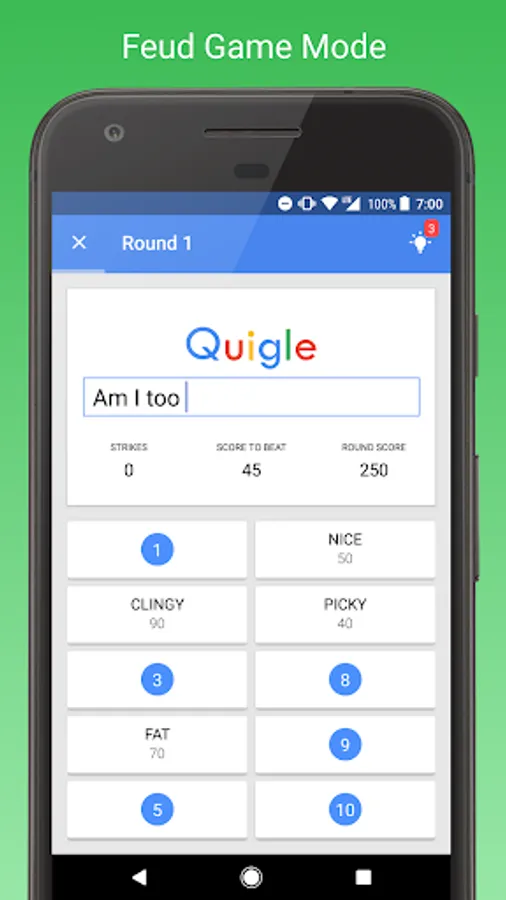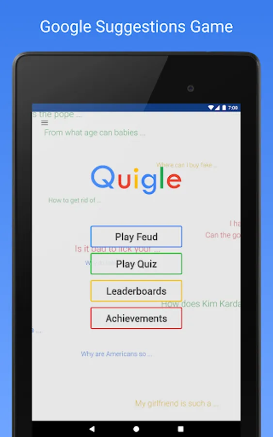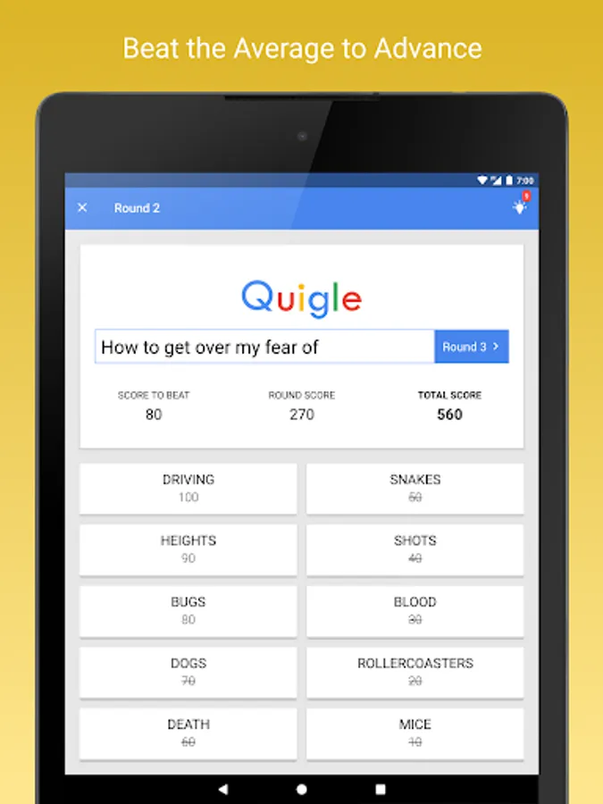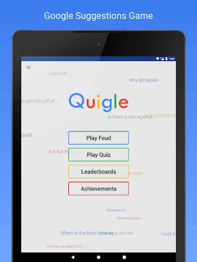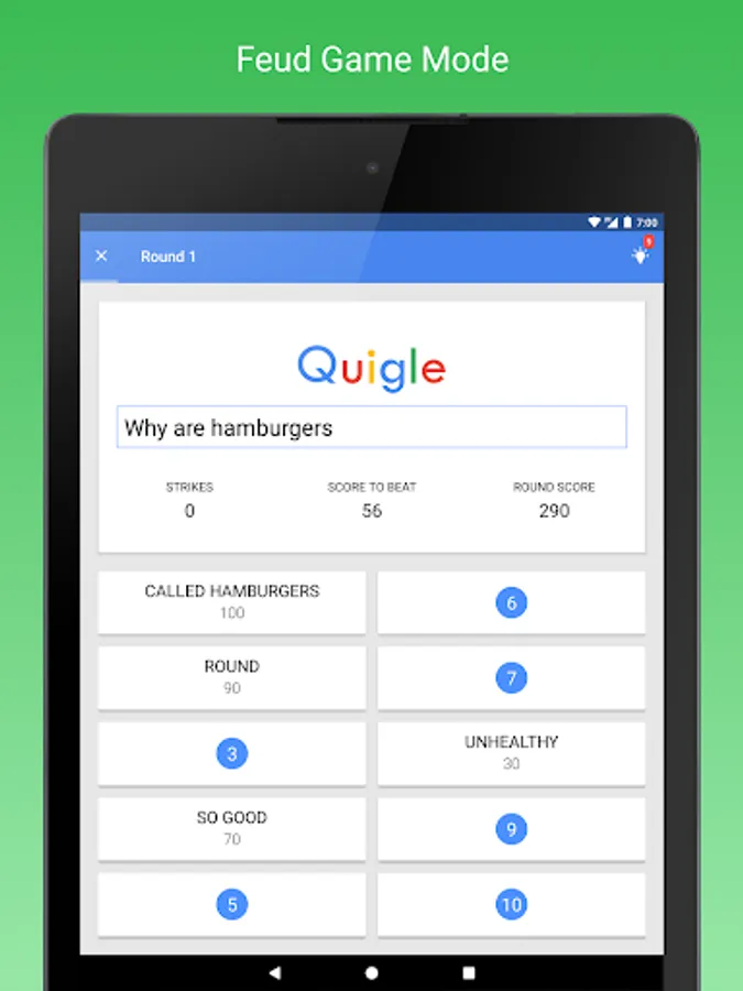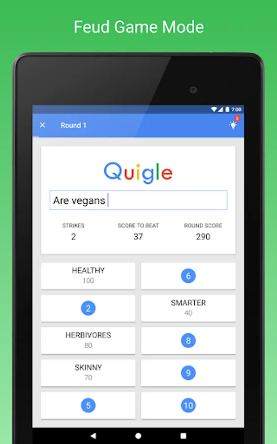 The purpose of Quigle is to try to pick the top search suggestion based on the beginning of a search. Suggestions are pulled directly from Google in real-time. Find out what people in your country are searching for by playing one of the two game modes: Feud and Quiz!