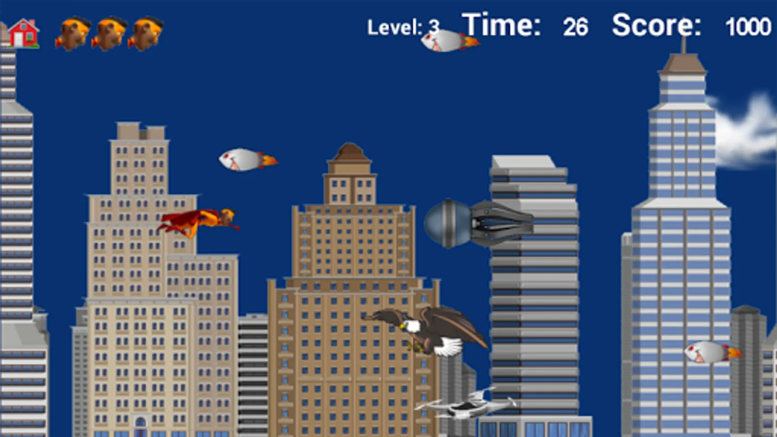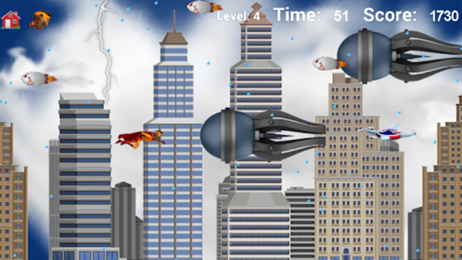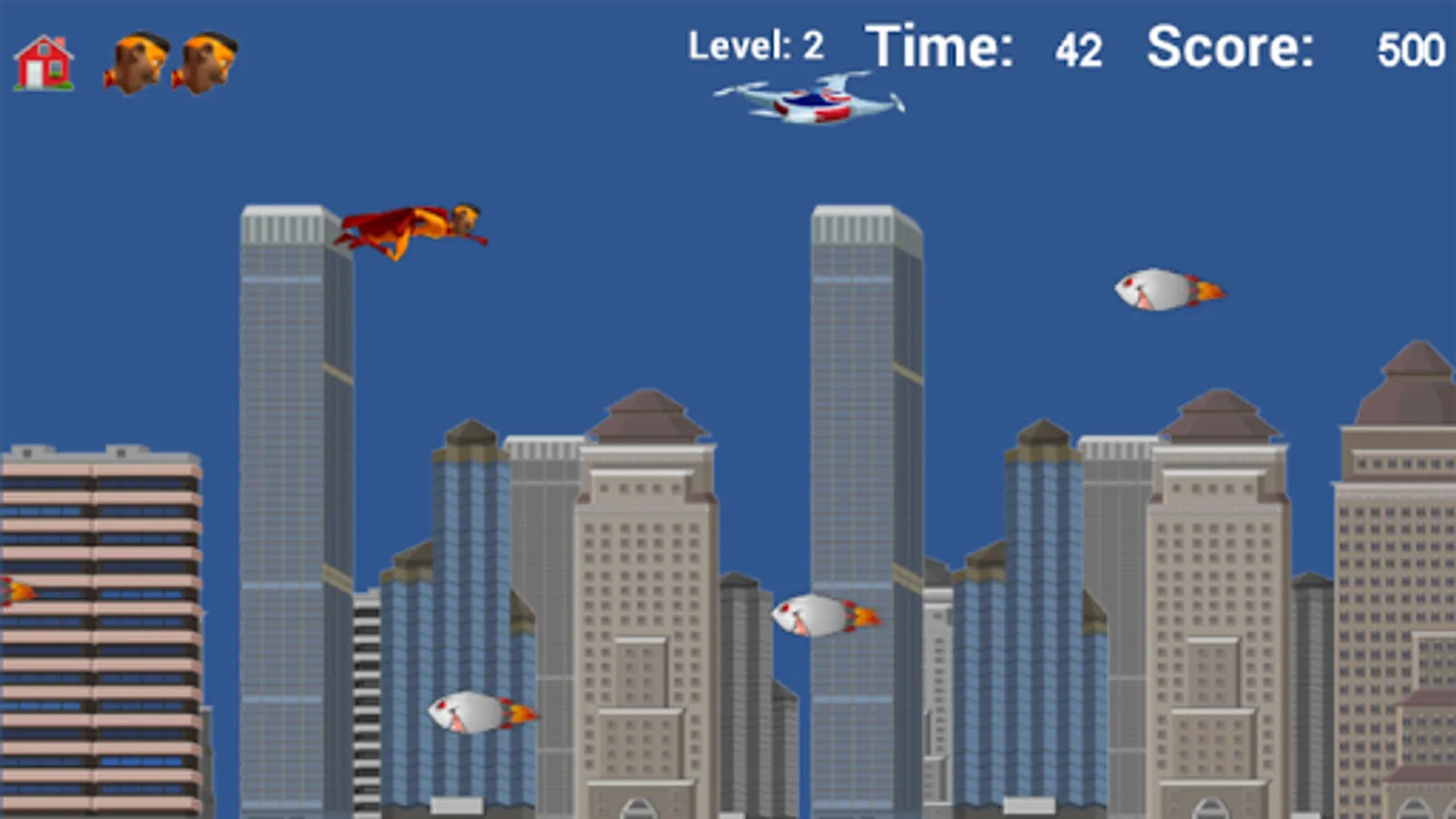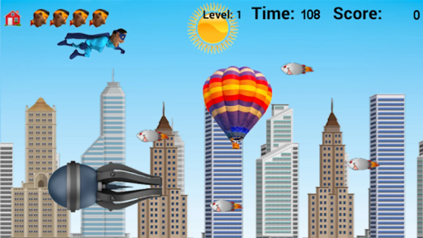 Superhero Flyer is a casual action leveled game where strategy pays off to win. 5 superheroes are on the team to save the city from reckless robotic rockets. The sun, moon, balloons, drones and wind-socks supply the power-ups.
