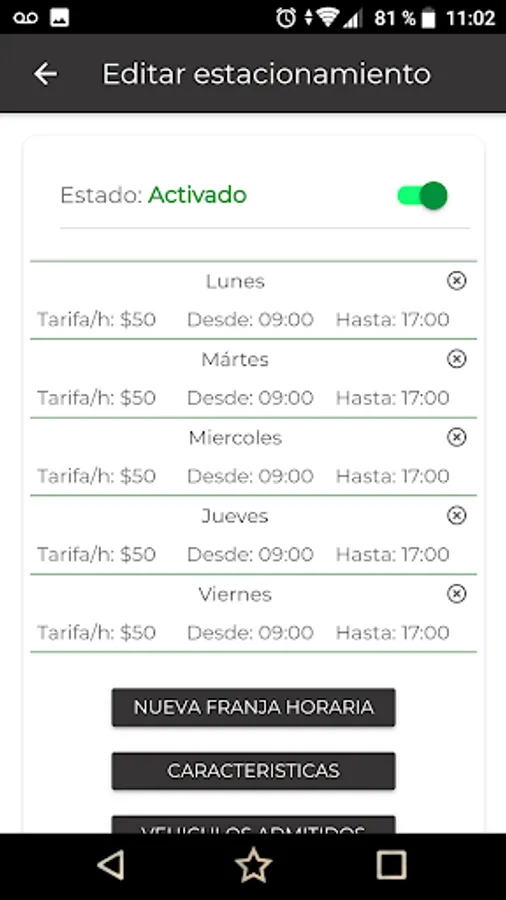 8. Finally, you must indicate the days, and time slot where parking will be available to be rented. And in the same step, you enter the price you want to charge per hour.