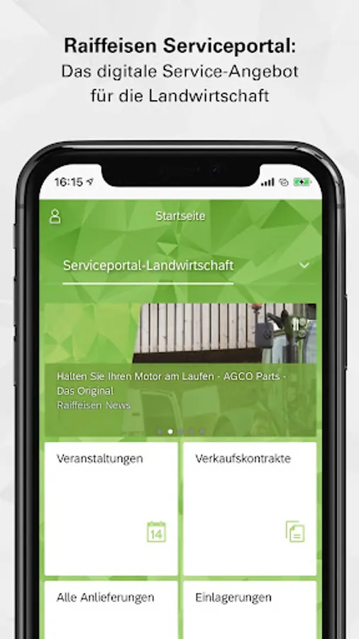 In the Agricultural Engineering section, you are given the opportunity to view the repair and workshop history (including associated documents) for your machines that have been serviced by Raiffeisen Waren GmbH. The Raiffeisen stock exchange tile gives you a structured overview of the entire range of used machines in the group. You can also conveniently order over 500,000 original and replica spare parts for your machines online via the spare parts shop.