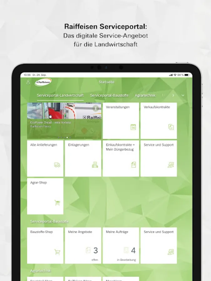 The Raiffeisen service portal for commercial building materials customers is divided into four functional areas: Building Materials Shop, My Offers, My Orders and Service / Support.