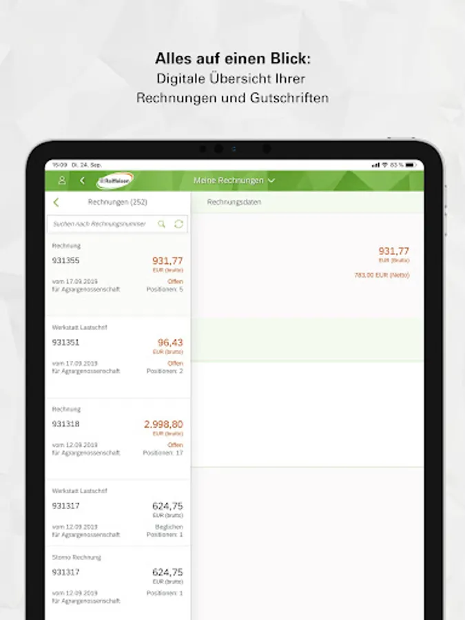 As a customer of Raiffeisen Waren GmbH, you can use the Raiffeisen service portal to view your business relationships with the company after logging in with your personal access data. In order to make the contents of the Raiffeisen service portal clear for you, the information is divided into different groups. Service portal- agriculture, agricultural technology, administration and invoices and retrieval from contracts. The data of the past 2 years (from the current date) are displayed.