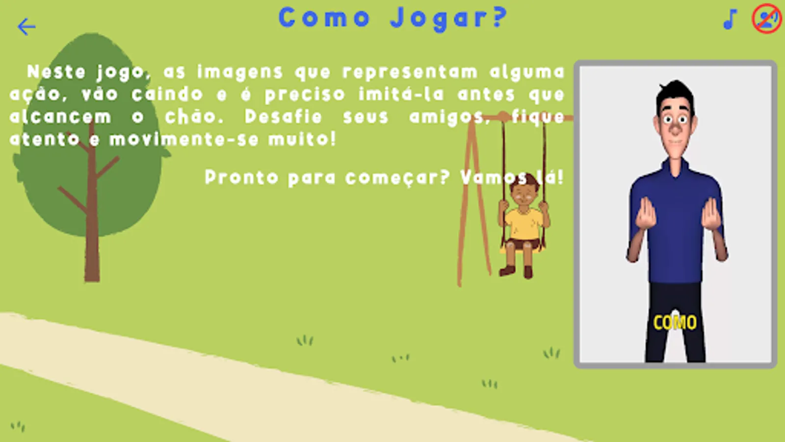 The game presents images that represent some action, these images appear in a falling form and it is necessary to imitate them before they reach the ground, it is an activity that can be done individually or collectively and the difficulty levels increase according to the speed that the pieces fall.