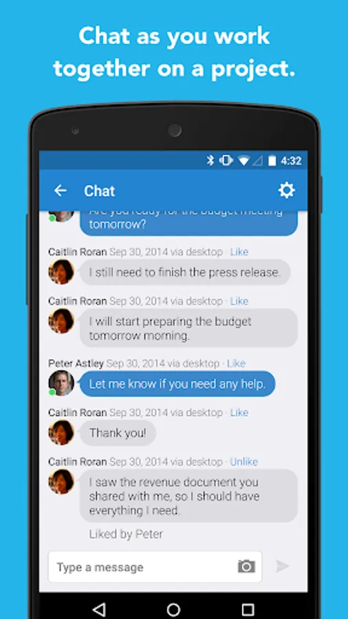 - All of your chats, docs, task lists, and spreadsheets are available on all of the devices you use — phone, tablet, and desktop