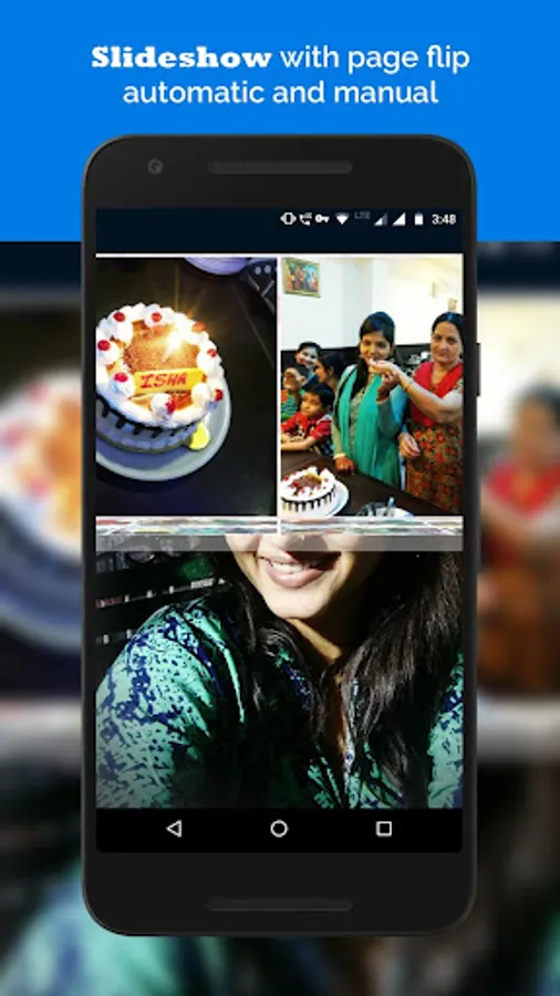 Slideshow :- User can see Slideshow of edited photos. Slideshow is also manual flip able that user can flip current photo to next or previous. Auto flip timing is adjustable in settings.