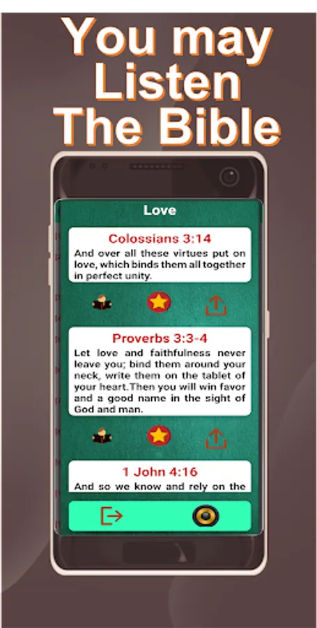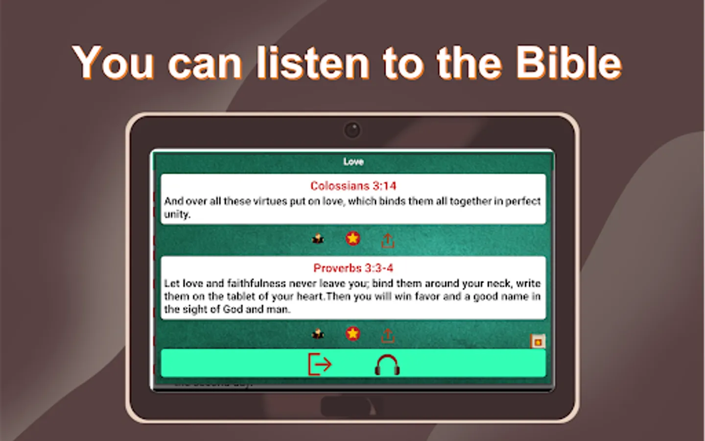 You can select one or several verses of a chapter and mark as a favorite you can also share with your friends the verses in the different social networks. By clicking on the favorite clip, you will see the verses that you marked for quick access.