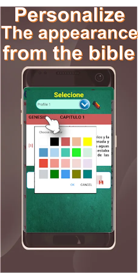The Search menu will allow you to place a word in a text field and search the entire bible, in the old or new testament. If you specify the search range it may take less time to find matches, but if you select the whole bible it will take longer to Find the results. The configuration will allow you to change the size of the letters and the reading mode (Night and day).