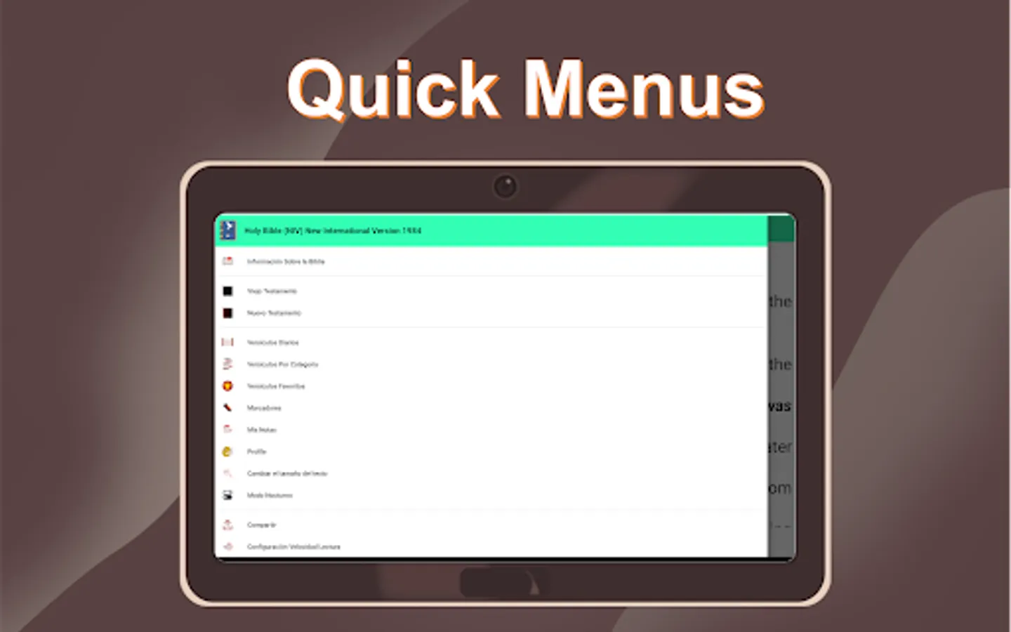 Access to the options menu quickly and sensibly. Option to change the text size. Change of reading background of the book. Access to favorite chapters and verses. Search for words in books, chapters and verses. Night mode to facilitate reading and decrease the light of the screen.