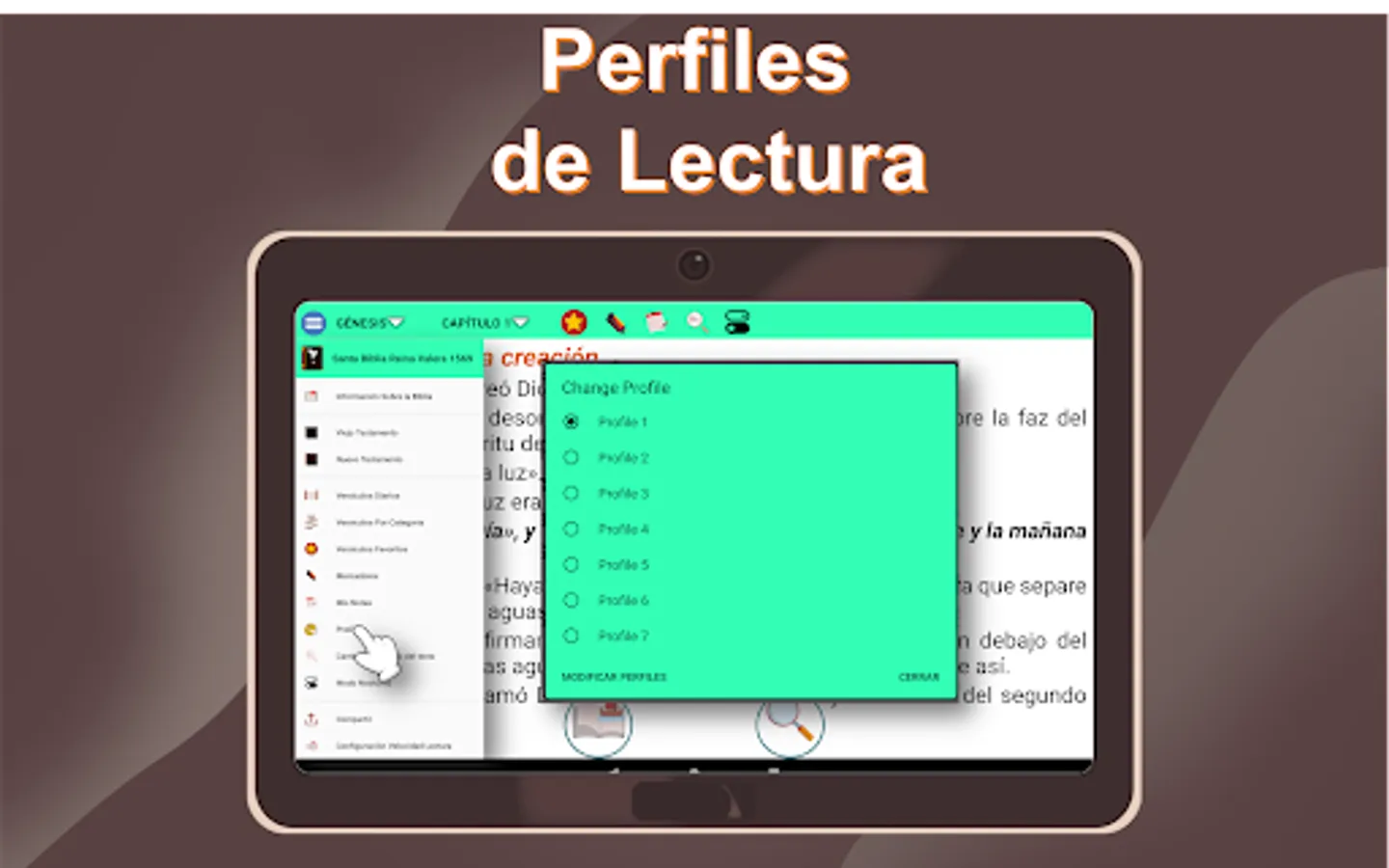 The settings will allow you to change the size of the letters and the reading mode (Night and day).