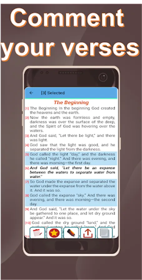 You can click on the screen and the lower part will show the name of the book and the chapter, when pressed, the list of books will appear and in the other the chapters that the selected book has. You can select one or several verses of a chapter and mark as a favorite you can also share with your friends the verses in the different social networks.