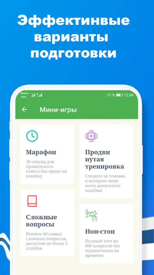• Non-stop: complete test of 800 questions without time limit