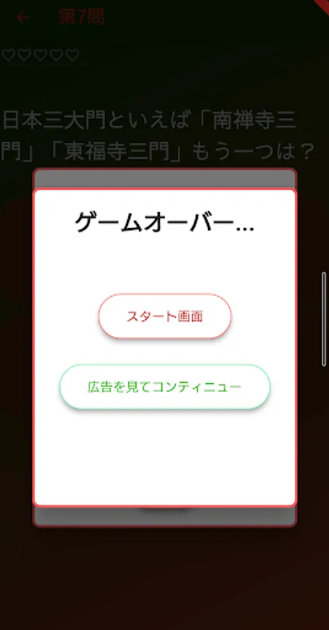 If you get 5 questions wrong, the Heart Gauge will drop to 0, and you can choose to start from the beginning or watch an ad and continue from there.