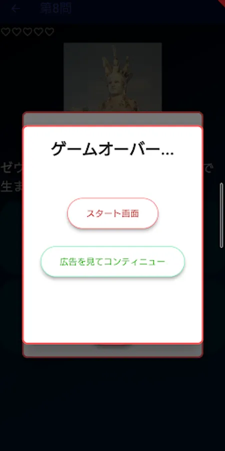 If you get 5 questions wrong, the Heart Gauge will drop to 0, and you can choose to start from the beginning or watch an ad and continue from there.
