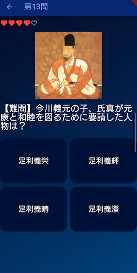 The questions are given roughly in chronological order from Ieyasu's childhood to the end of the Edo period, so even those who are not good at memorizing chronological tables can learn about Tokugawa Ieyasu's life by playing this app.