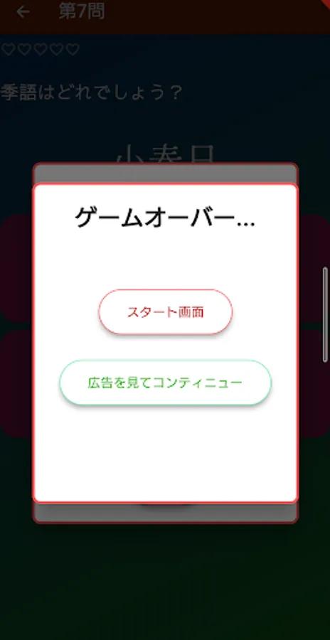 If you get 5 questions wrong, the Heart Gauge will drop to 0, and you can choose to start from the beginning or watch an ad and continue from there.