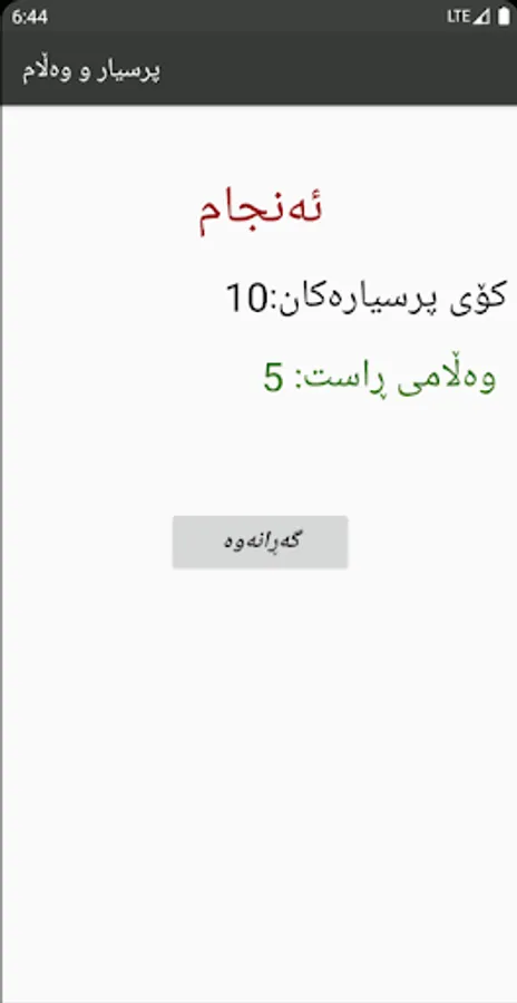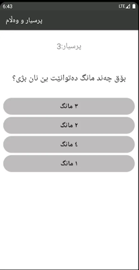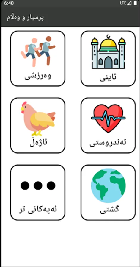 ئەپی پرسیار و وەڵام پێک هاتووە لە ٥ بەش (ئاینی--وەرزشی--تەندروستی--ئاژەڵی--گشتی) هەربەشێک زیاتر لە ٣٠ پرسیار لە خۆ دەگرێت