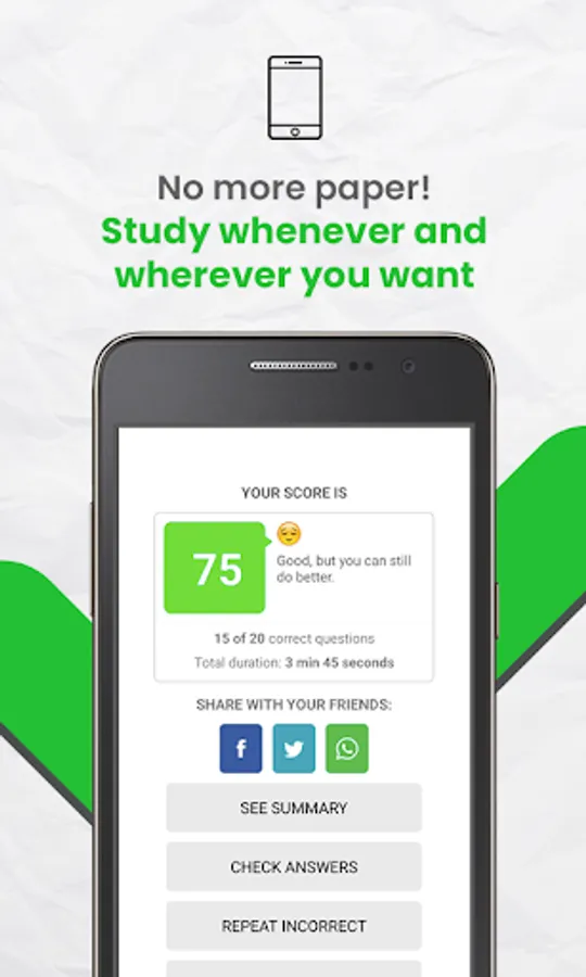 Forget about going two or three times to do an exam. Get ready with Quiziz and pass it at the first try. The best: is free. Besides, Quiziz has a Premium version that allows you to be more prepared with check answers, repeat incorrect and expert level functions. You can activate any of these functions by buying them from the free version anytime.