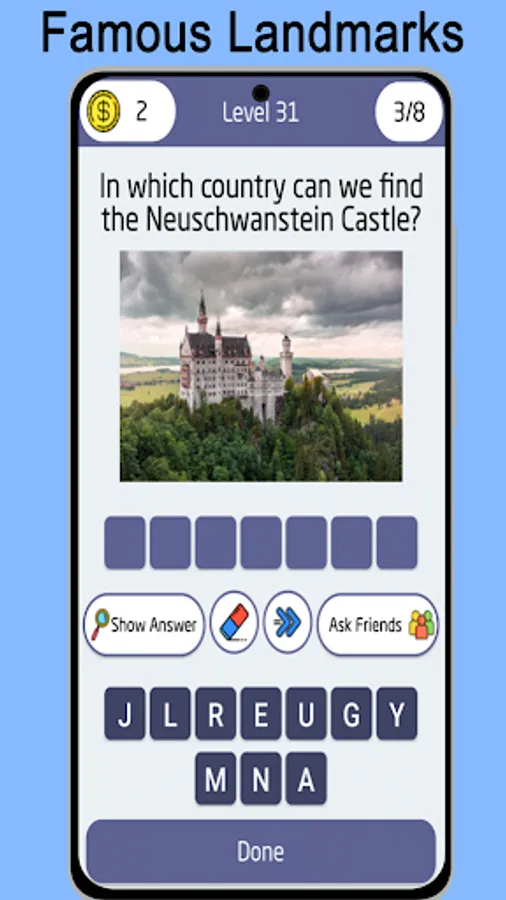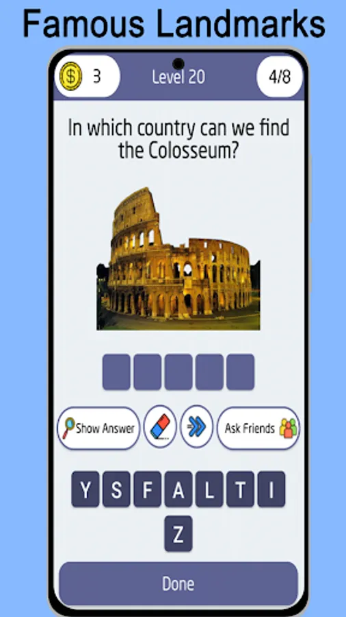 - Questions about the most famous landmarks in the world like Eiffel Tower, Leaning Tower of Pisa, Colosseum, Empire State Building, Stonehenge, Taj Mahal, Burj Al Arab Hotel, Great Wall of China, the Grand Canyon and many more.