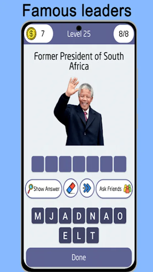 Test your general knowledge by answering hundreds of different questions given to you by Quiz Game: General Knowledge app. beneficial questions from a variety of topics like geography, history, sport, science, famous landmarks, famous leaders, animals and much more. So what do you know about general knowledge? Take Quiz Game: General Knowledge to find out now!