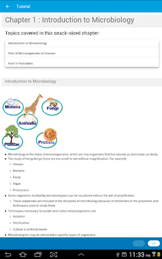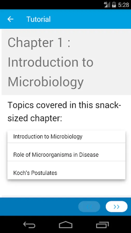 You have limited access to the content provided. For full access to the content, please login and purchase this application. This app provides a quick summary of essential concepts in Microbiology by following snack sized chapters: