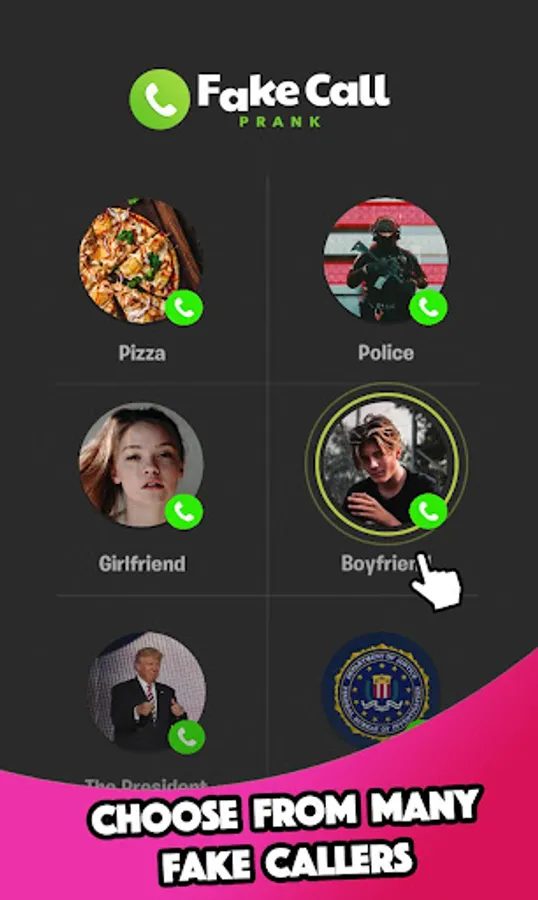 - Choose your favorite prank from a list of many fake call options - like girlfriend, police, pizza
