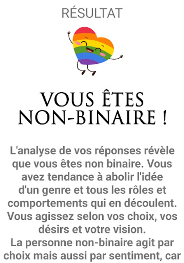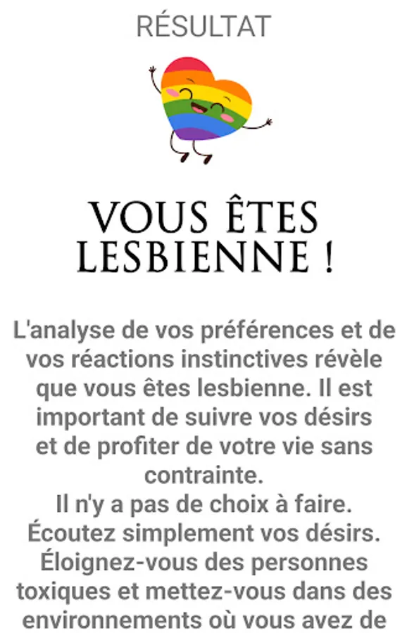 At the end of each quiz, you receive a personalized analysis of your answers, which helps you better understand your own sexuality.