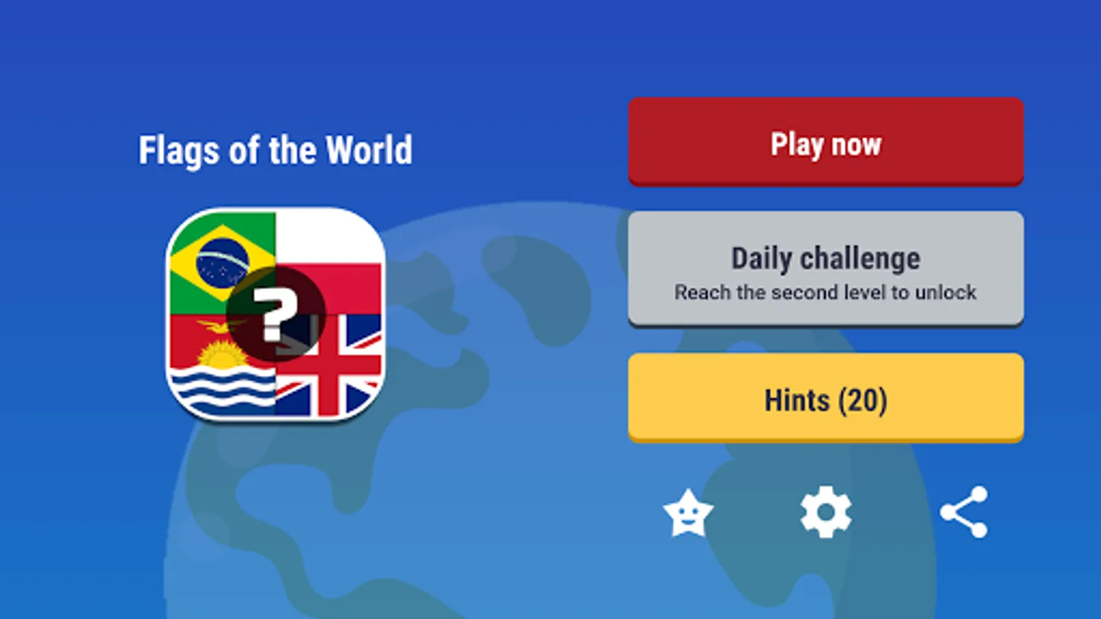 Many people think that they have a very extensive knowledge about the world. How hard it is to identify some country national flags, right? We bet you can identify USA flag and UK flag right away. While we can definitely recognize USA flag, UK flag, and some Euro flags, we might not be able to identify some more obscure worlds flags such as Nigeria, Senegal, or even Poland. Maybe you will give up and say I don’t know. However, we all can learn and memorize so the next time you answer it, you can give a correct answer. We also have hints, so if you think that “I don’t know”, you can use the hint to help your memory and find the correct answer. Don’t worry, our game is unlike the classic geography test you had at school where you have to memorize Europe map and difficult facts. Our game is very fun, colorful, and simple. You don’t have to memorize the whole Europe map, you only need to recognize the flags of the nations of the world!