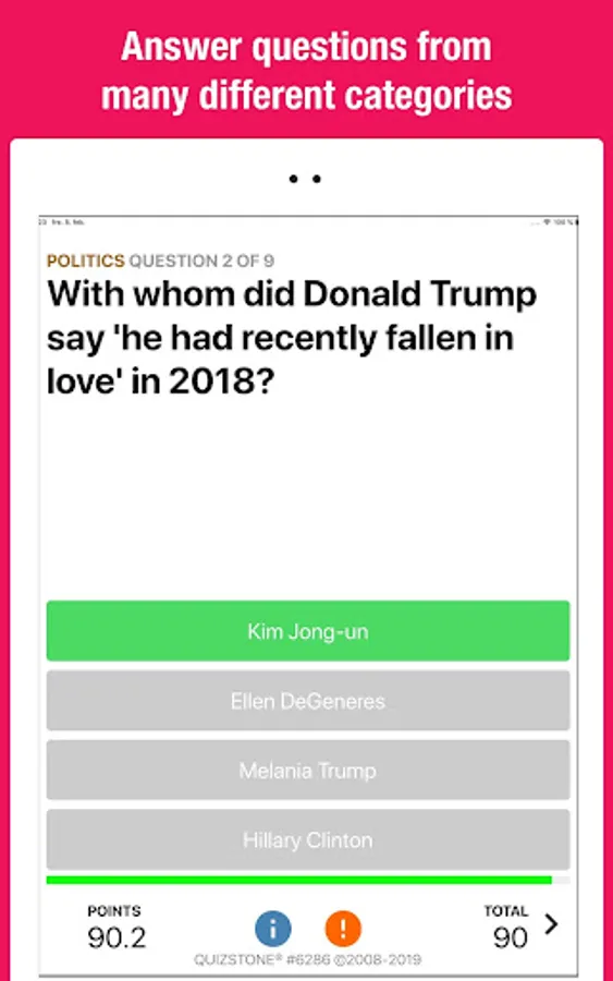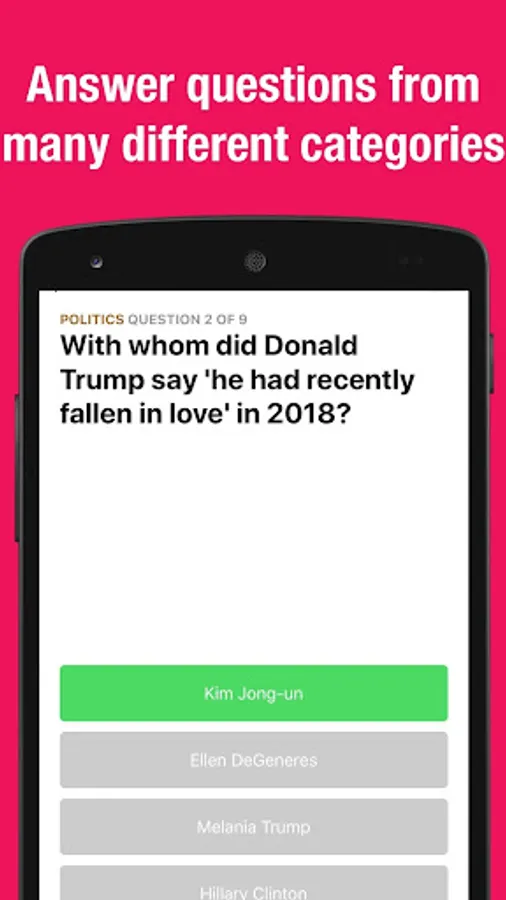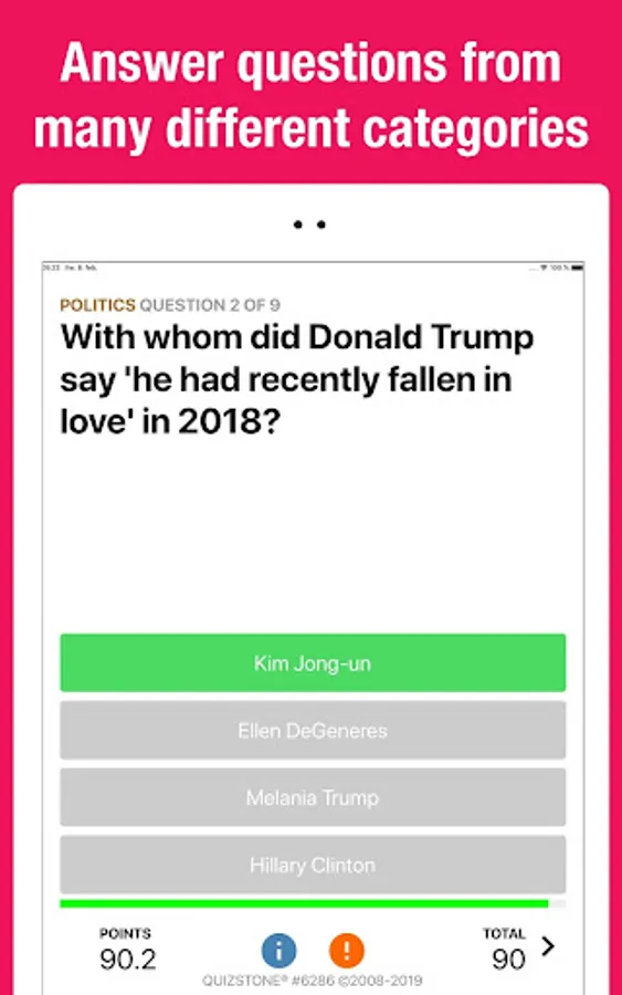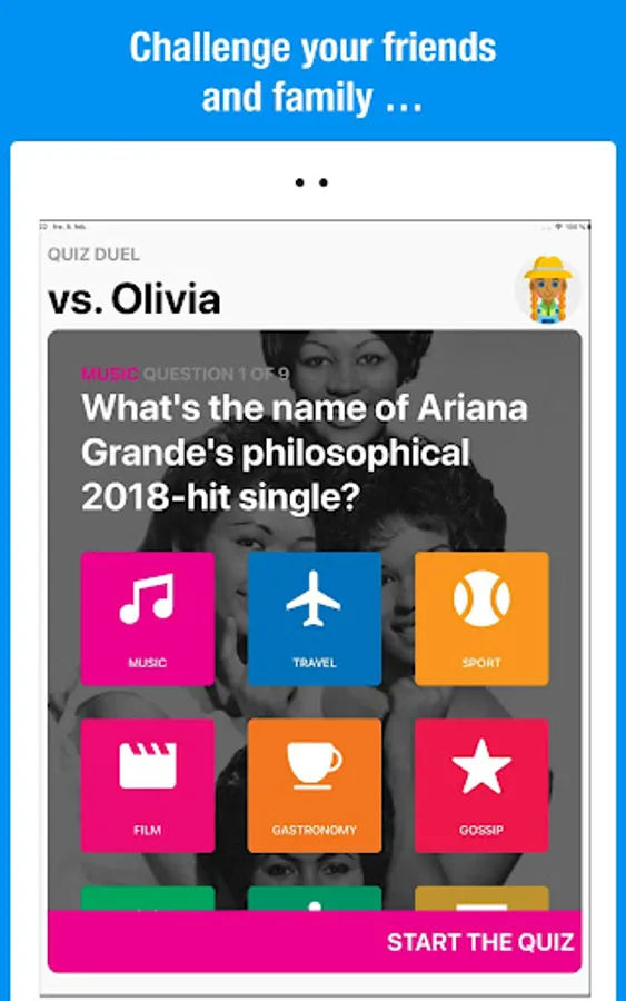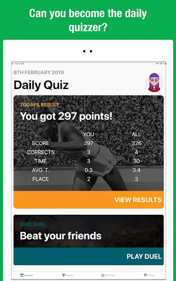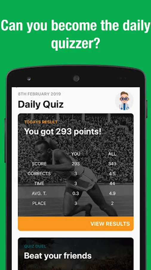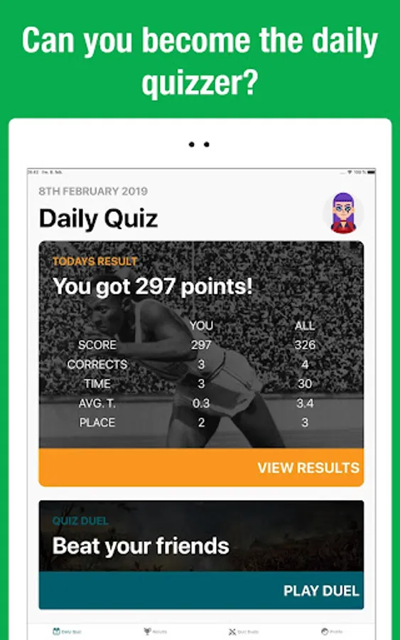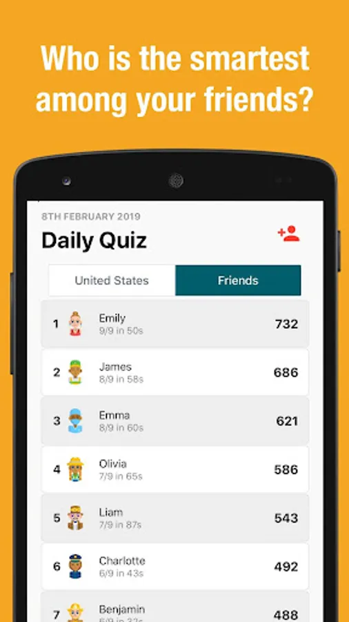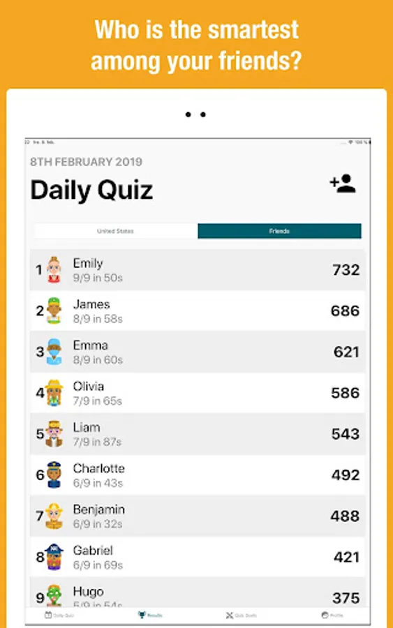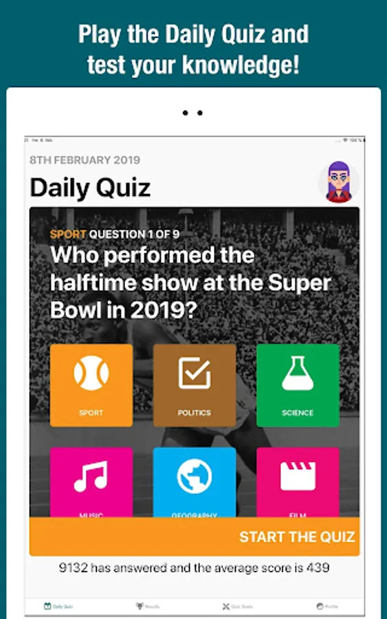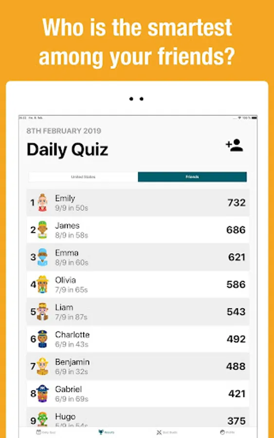 Every day you can play a new quiz with 9 questions from different categories. Be fast and spot the right answer. Your score depends on both speed and accuracy. First compare your daily result with everyone who has played already. The check how you rank compared to friends and family.