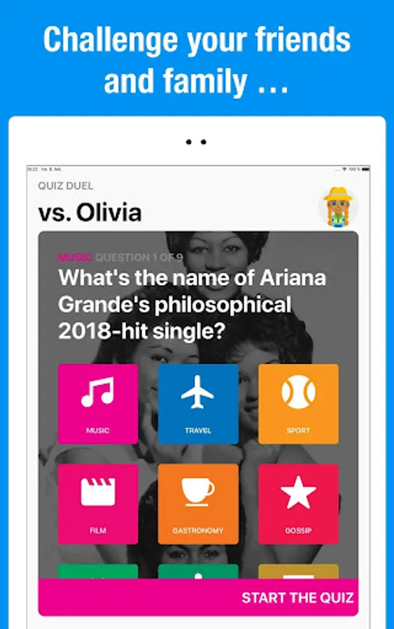 Play the daily quiz and then beat your friends in a multiplayer quiz battle. After log in you can play this trivia game with your self or against other players.