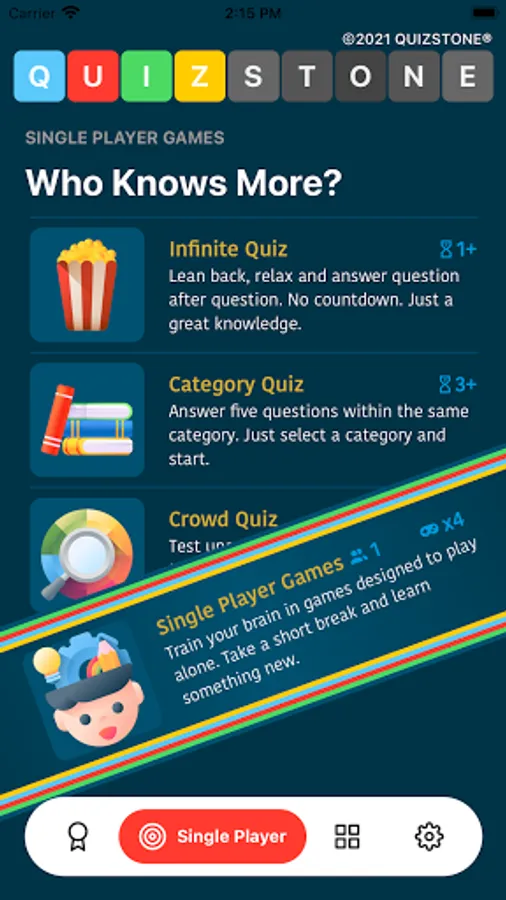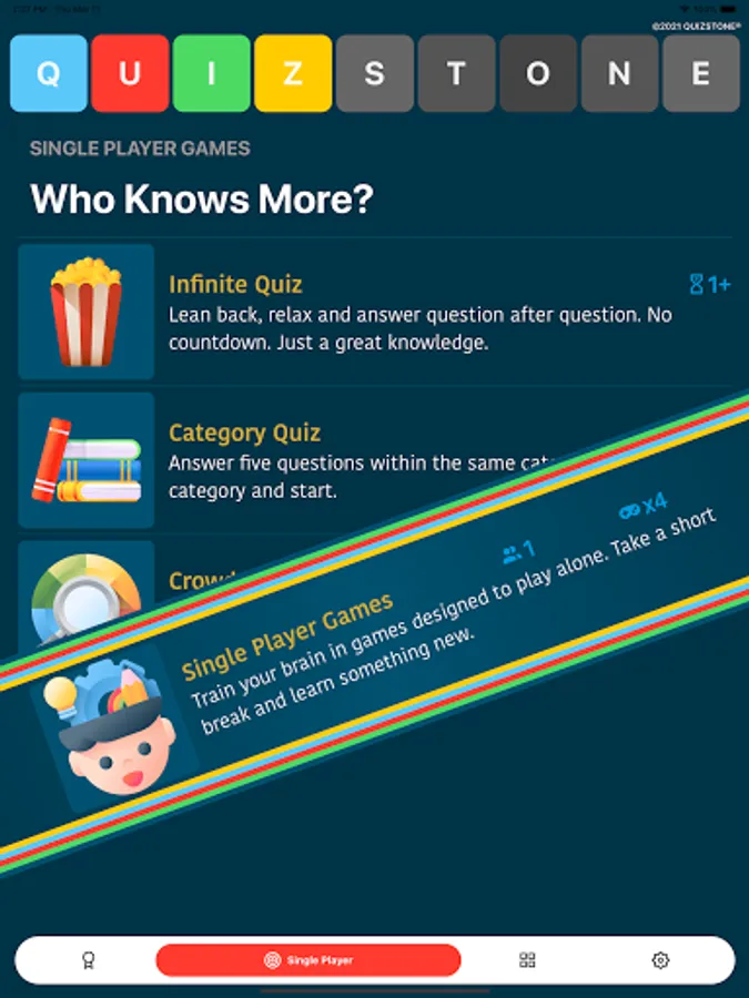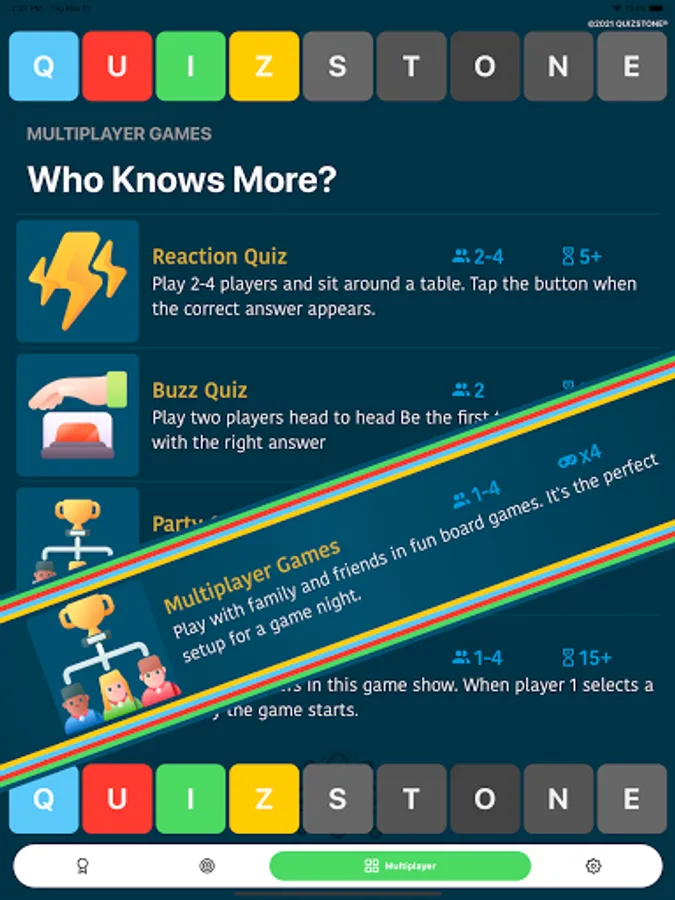 Play QUIZSTONE® with your friends and family. Choose from 10+ fun game variants that can be played by 1-4 people. You can play leaderboard games, single player games and multiplayer games.