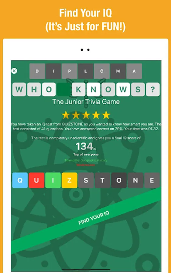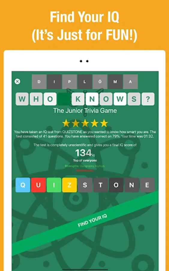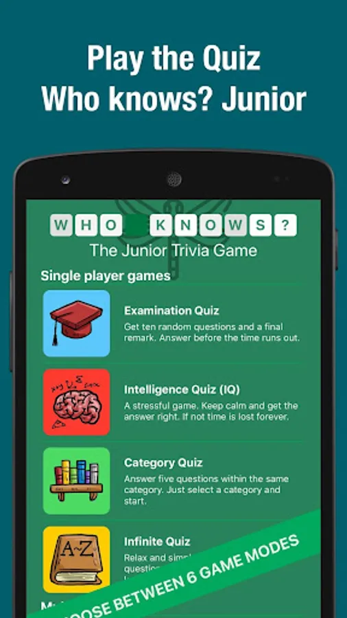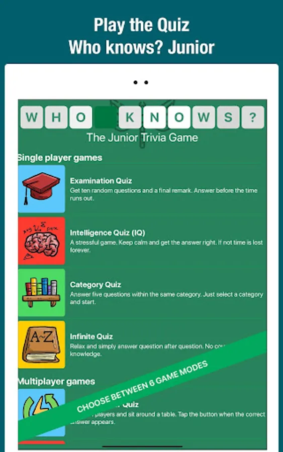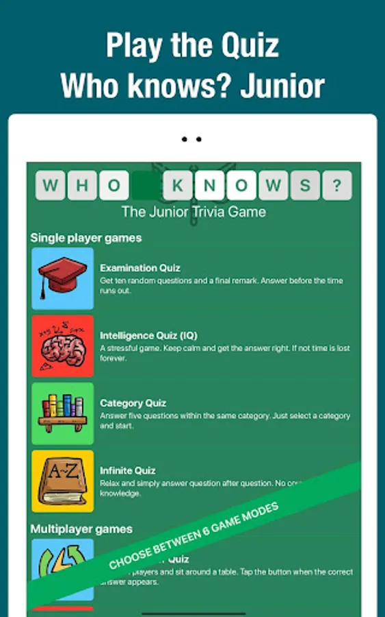 Play "Who Knows? Junior" and test yourself or challenge friends and family. Six different game modes and hours of entertainment and knowledge is waiting for you..