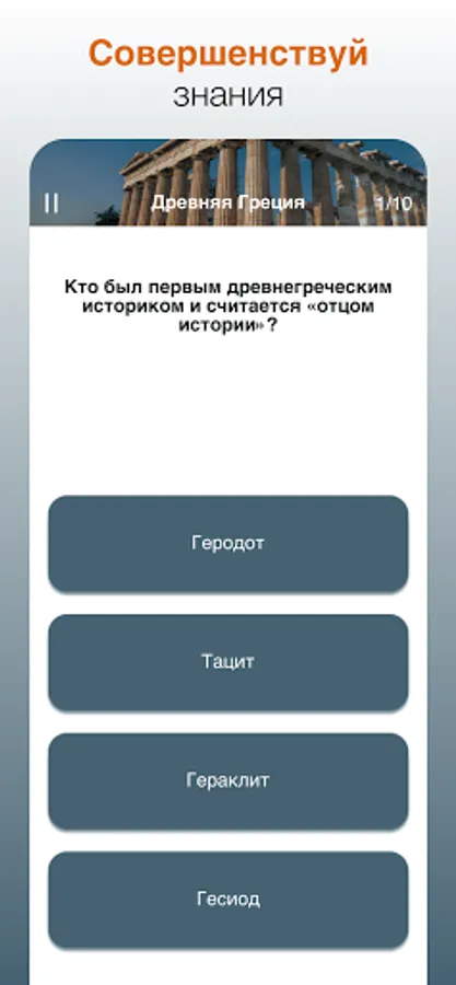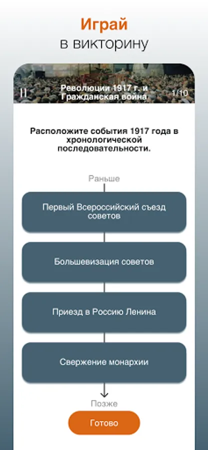 Quizu History is an intellectual quiz about history, from Ancient Greece to Yeltsin! Just a quiz without unnecessary details, but not boring. Hundreds of questions, 48 topics, and many more explanations. Therefore, if you do not know something, we will tell you.