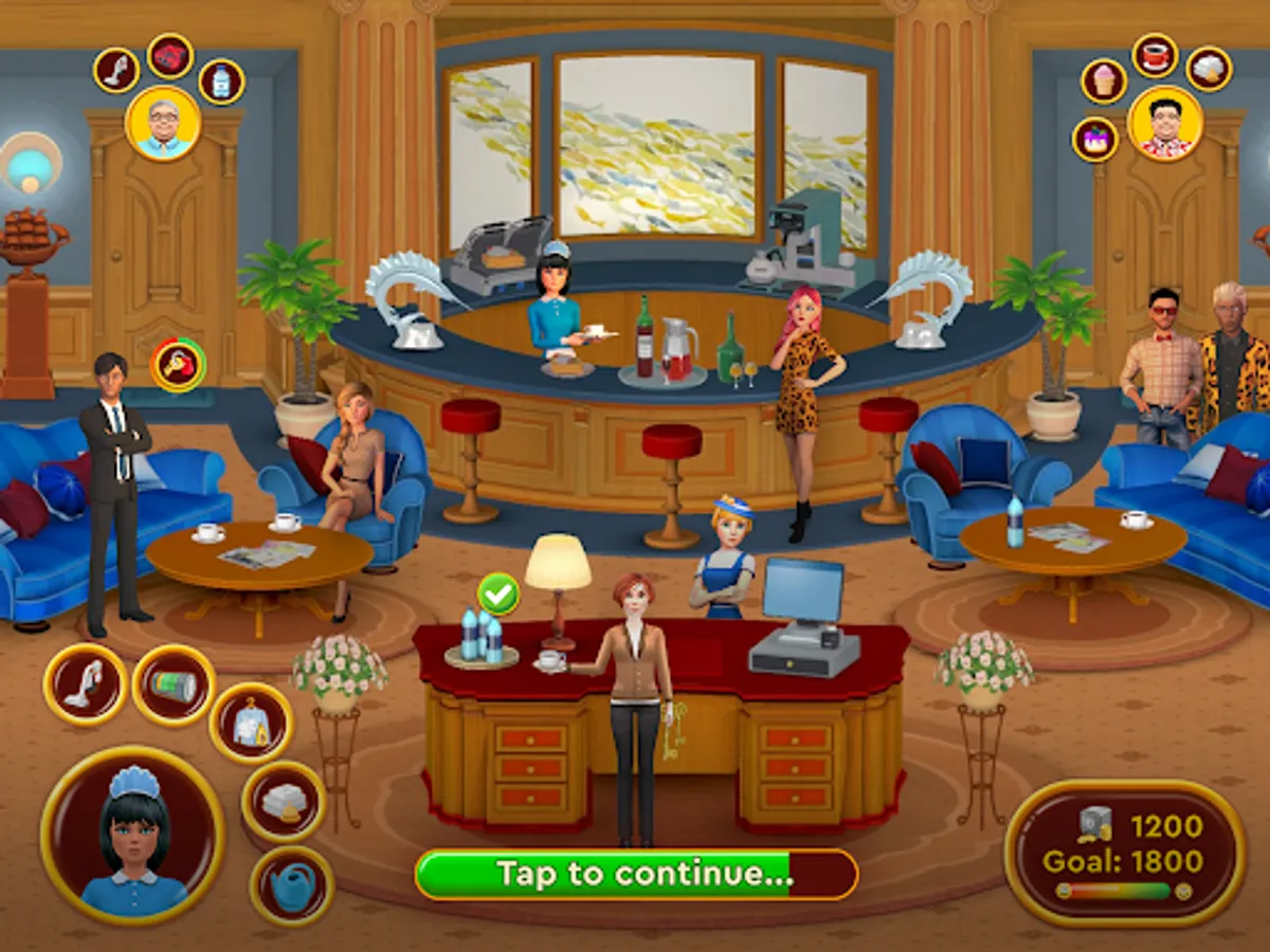 Three different hotels, each one is bigger and more challenging. Each hotel has a lot of upgrades which increase its popularity. When hotel popularity grows you can buy a Star-Up - that adds a new star to the hotel and totally upgrades its appearance. Upgrades increase popularity and more different guests will be attracted to your hotels.