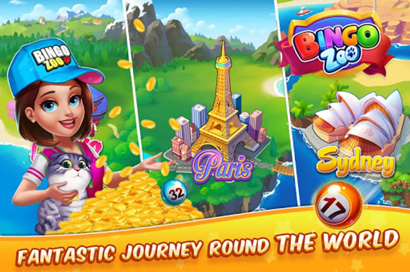 Take a tour in Bingo Zoo with your friends and family to join a free bingo world and enjoy an odyssey to places of interest around the world.