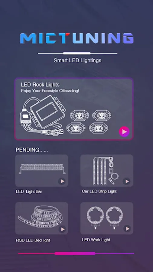 MIC LEDS APP can control MICTUNING a series ofBluetooth-enabled LED Rock Lights, RGB LED BedLights, LED Work Lights, LED Light Bar, etc. throughBluetooth connection.