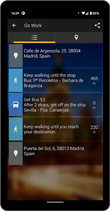 The points of origin and destination are specified by entering an address or place, pointing on map or allowing MadridBus to geolocalize you. It's that simple.