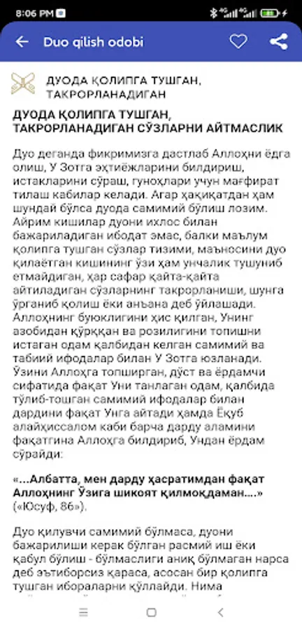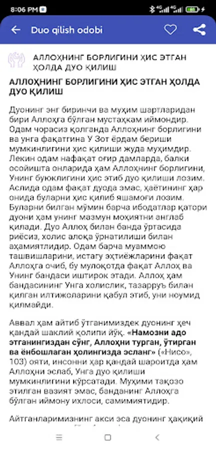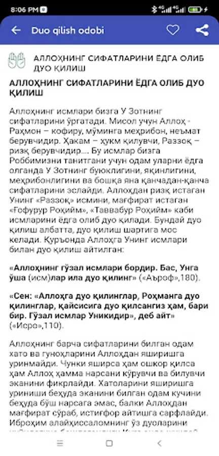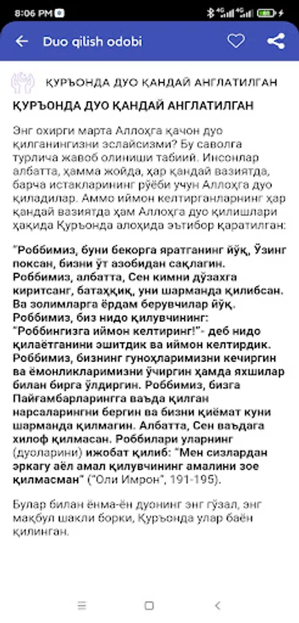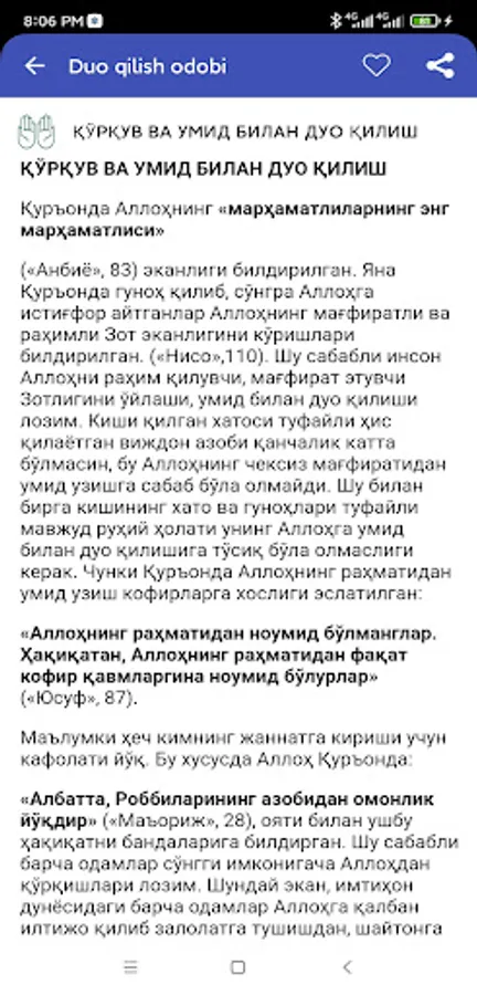 Duoning ahamiyati Qur’onda: “Agar duo-iltijolaringiz bo‘lmasa, Robbim sizlarga hech qiymat bermas”, “Furqon”, 77, oyati orqali bayon qilingan. Allohga duo qilishda, unga yaqin bo‘lishda hech qanday chegara yo‘q. Duo - Alloh bilan bandani bog‘lovchi vosita, Allohga bog‘lanish, unga iltijo qilish ehtiyoji esa insonning fitratida bor.