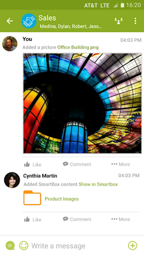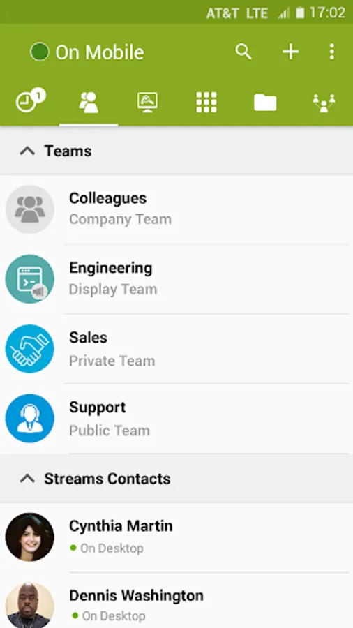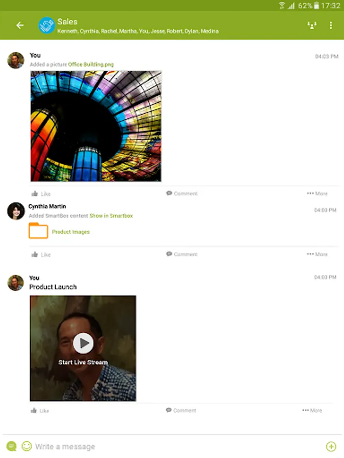 • Multi-media, persistent team messaging supports text, links, audio, video, images, files, folders and live broadcasts