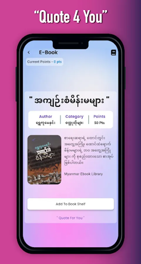 Best Quotes and Poems are an app that provides with different topics. There are more than 1,000 quotes, more than 100 authors and more than 100 topics. This application was created for humanity project. When you got points from Premium topic by clicking Get Points, you can use this points for reading eBook and Manga [Eng Sub] and can get certificate.