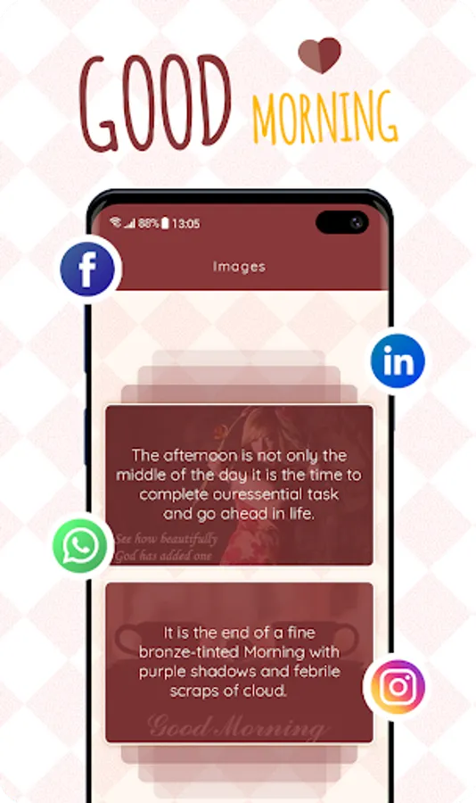 Good Morning Messages Imagesapp is best application to share all kind of wishes like Good wishes and so on using whatsapp , facebook , instagram , tumblr , google plus etc .. all social apps.
